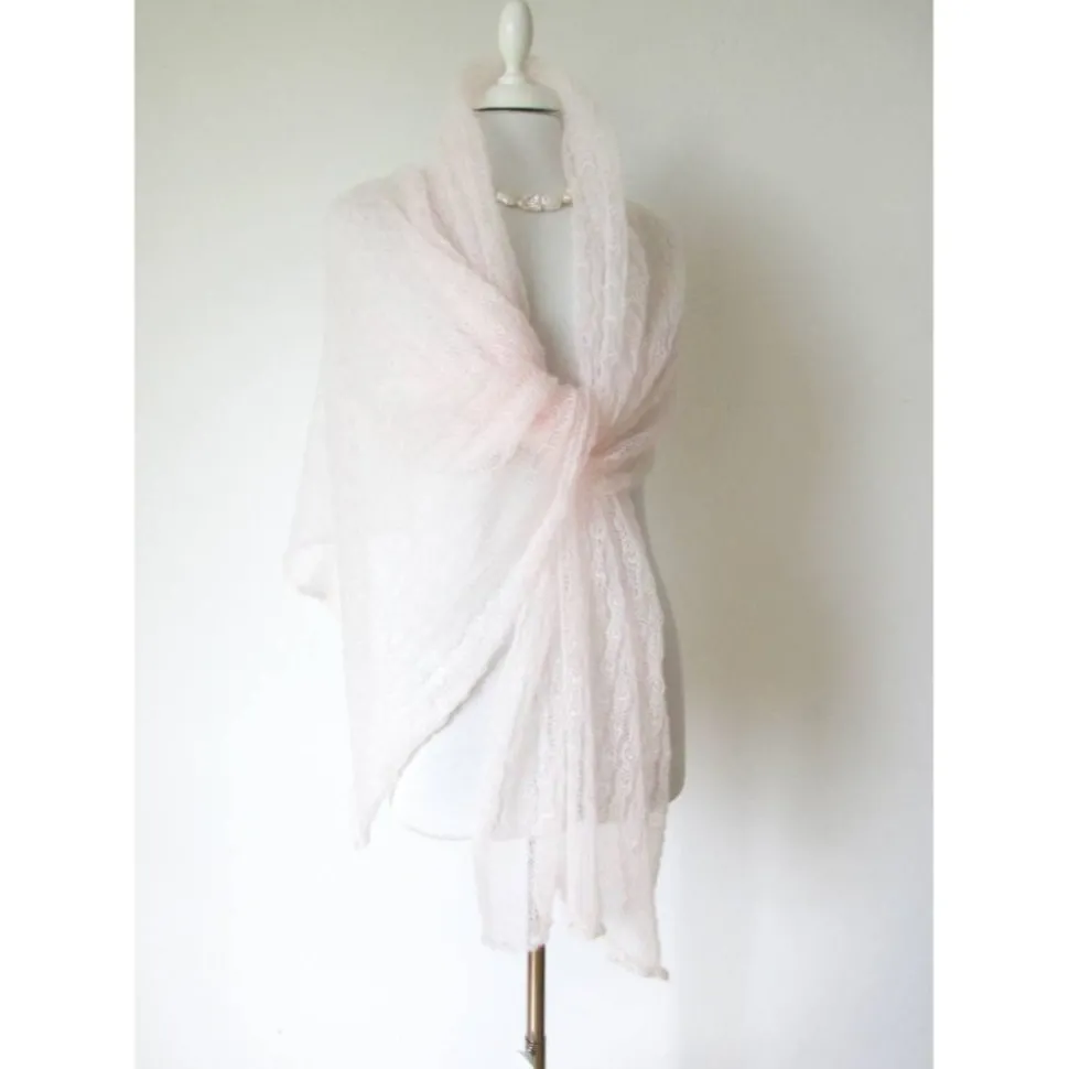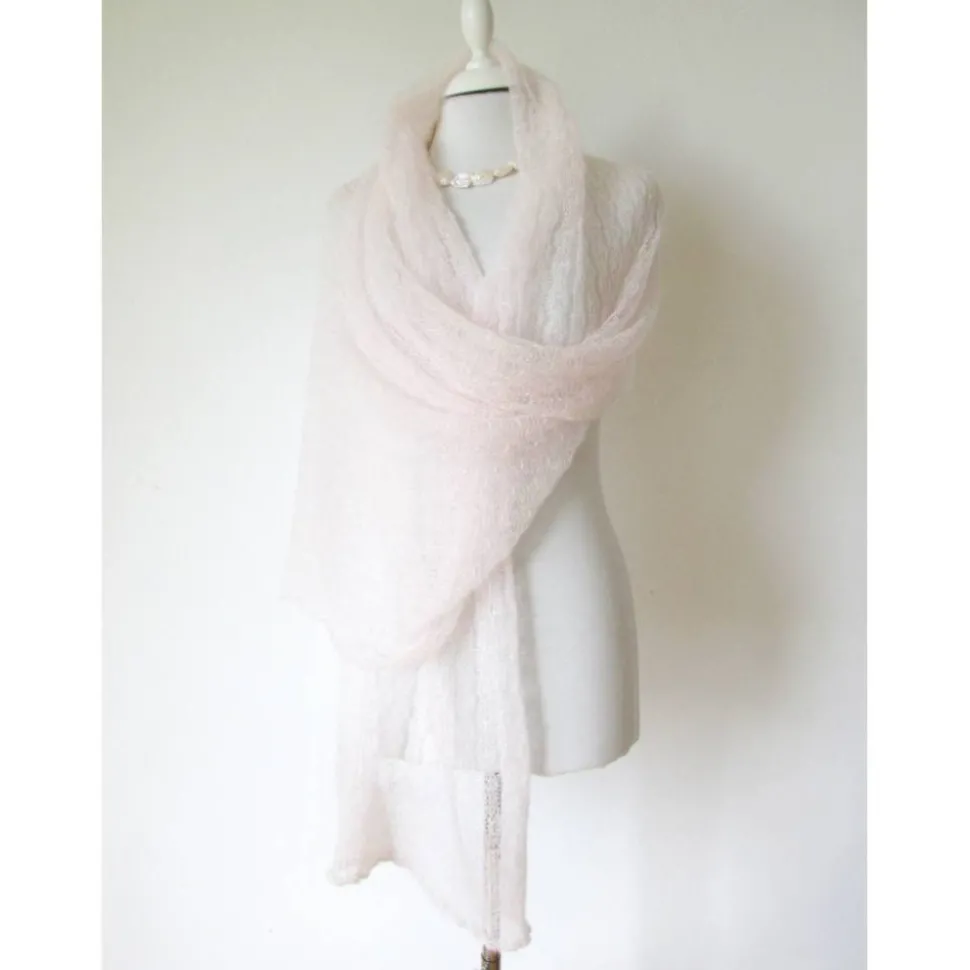 Leichte Strick-Stola, handgefertigt aus feinstem italienischen Mohair-Garn in zartem Softrosa. Der Rosa-Ton ist fast schon weiß – es ist ein Hauch von Rosa und erinnert mich an die pastellen Farben der Kirschblüten.