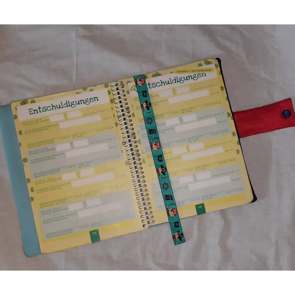 Achtung! Diese Hülle ist passend für ein Hausaufgabenheft mit Spiralbindung, da viele Schulen mittlerweile eigene Aufgabenhefte drucken lassen. Ich kann sie aber nochmal neu für normale Hefte anfertigen.