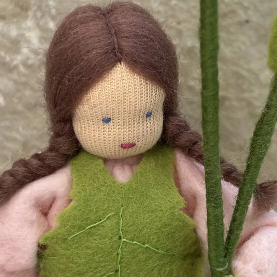 Das Püppchen ist unten geschlossen und für einen guten Stand unten mit feinem Dekokies und der Rest mit reiner Schurwolle gefüllt.
