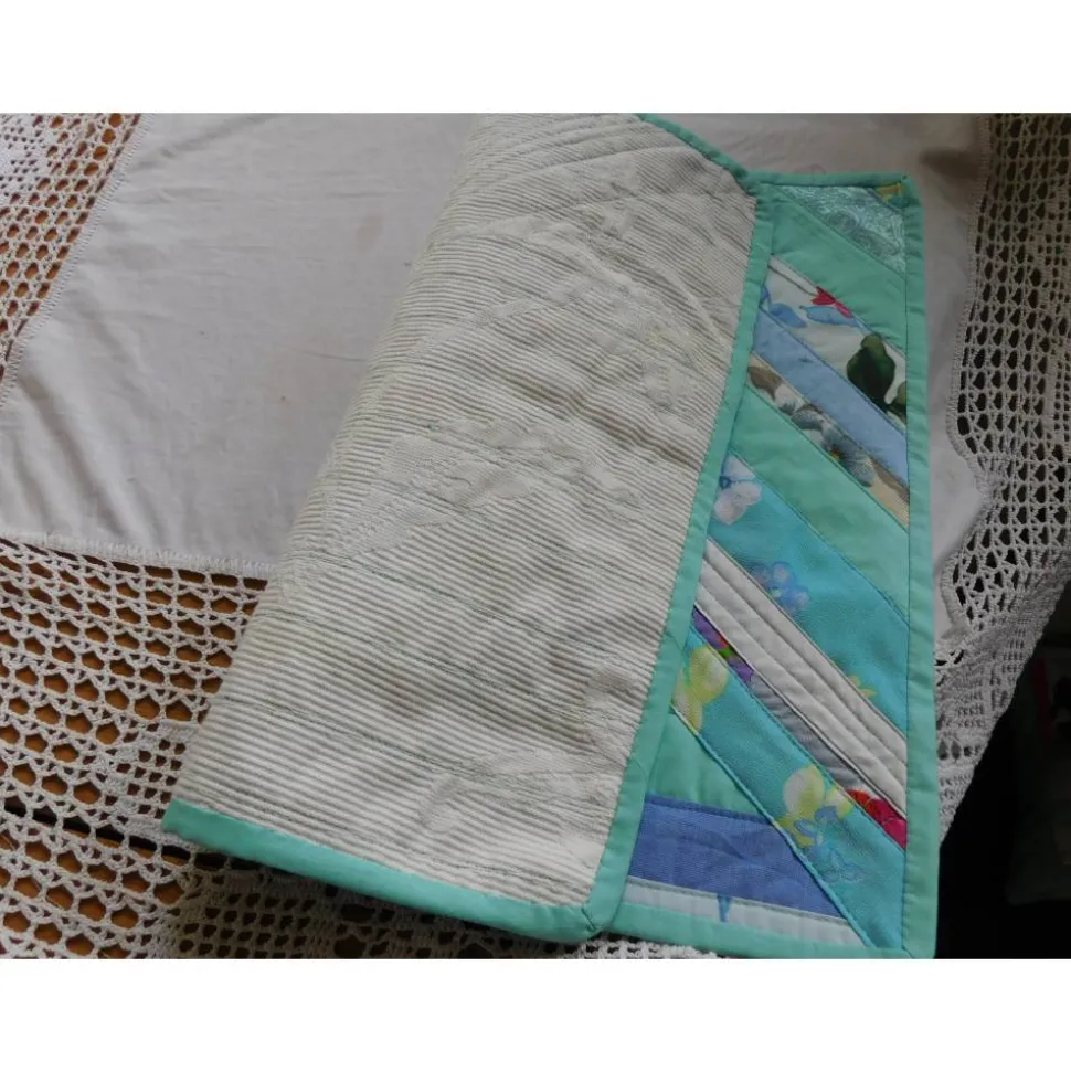 Dieses Platzset habe ich aus vielen Streifen in den Farben hellblau , mint , rosa in Patchworktechnik hergestellt und gequiltet.