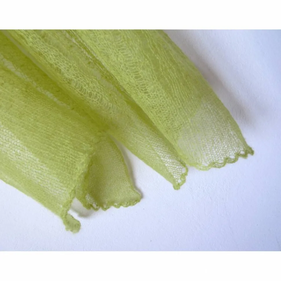 Feine, leichte Sommerstola handgefertigt aus dünnem italienischen Mohair-Garn. Das Grün ist ein schöner, frischer, heller Farbton. Das Accessoire ist federleicht und weich – es hat eine duftige Maschenstruktur. An beiden Enden sind schöne bogenförmige Abschlüsse gearbeitet.