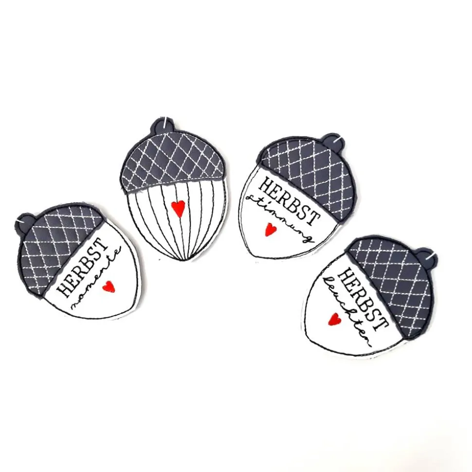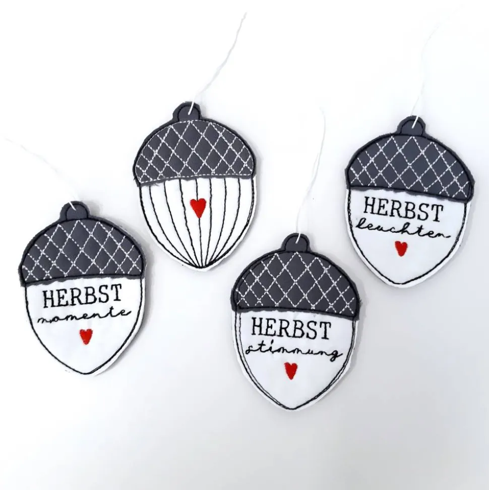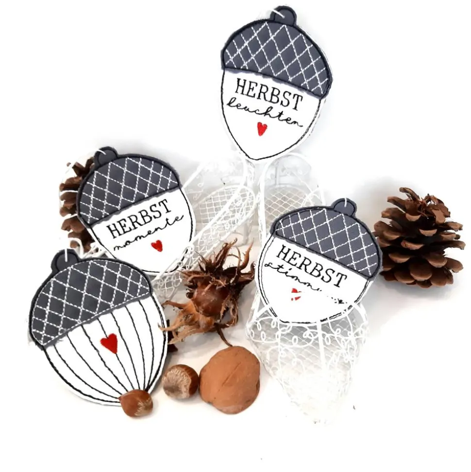 Liebevoll gearbeitet und bestickte Eicheln im 4er Set zum aufhängen oder als Geschenkeanhänger. Eine hübsche Dekoration zur Herbstzeit mit aussagekräftigen Schriftzügen.