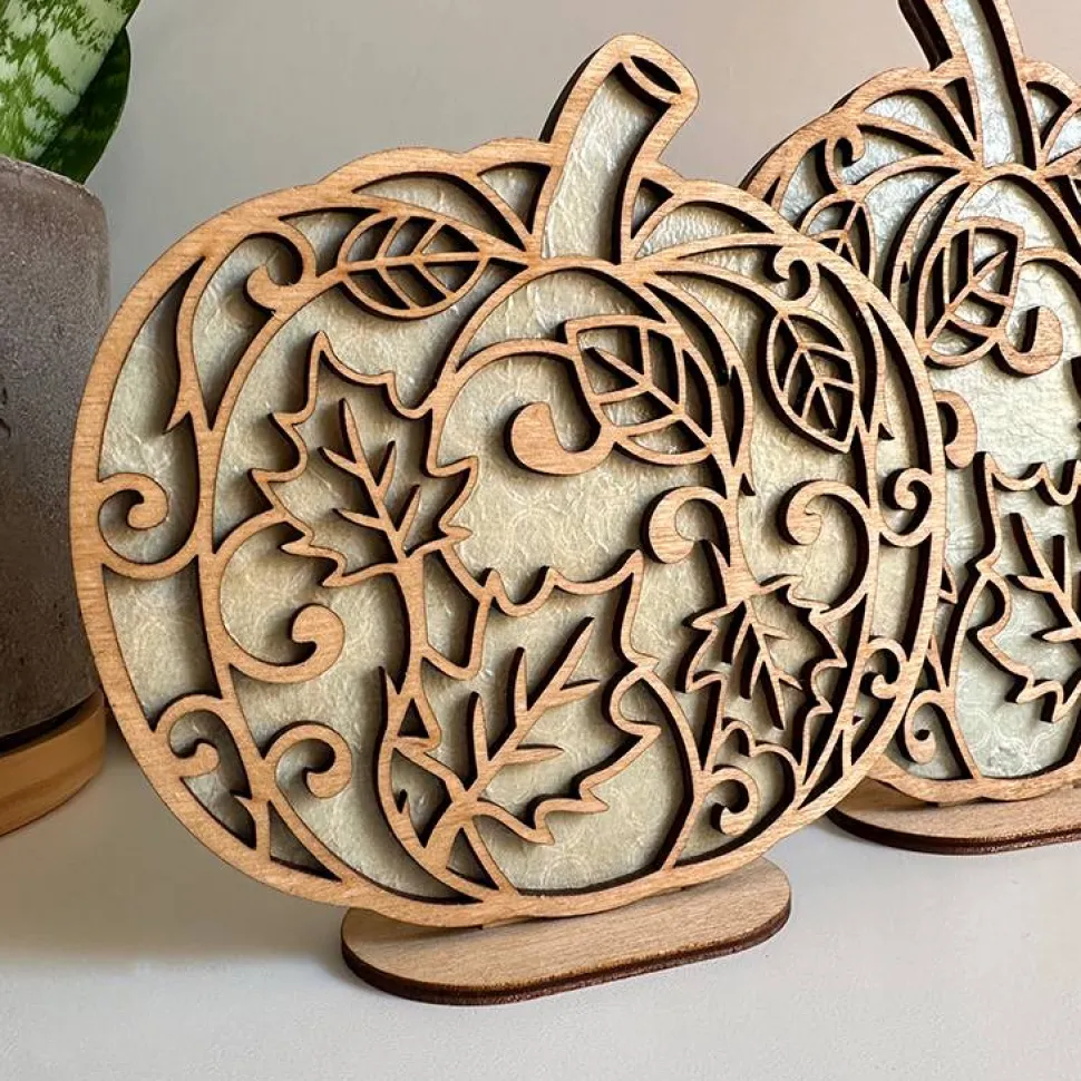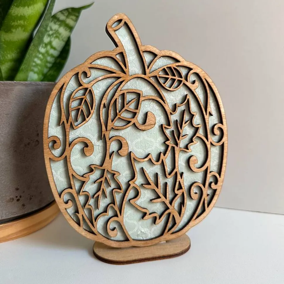 Die Blende mit filigranen Blättermotiven wird gebeizt und verklebt. Der Standfuß ist separat, die Kürbisse können ganz einfach eingesteckt werden und bei Bedarf selbst verklebt werden.