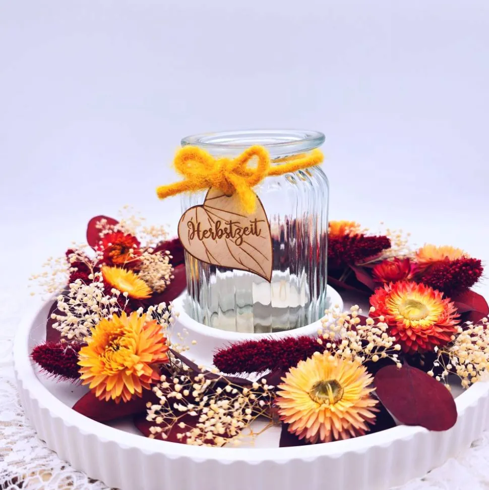 Das Windlicht wurde mittels senfgelber Kordel umwickelt und mit einem gelaserten Blatt „Herbstzeit“ dekoriert.