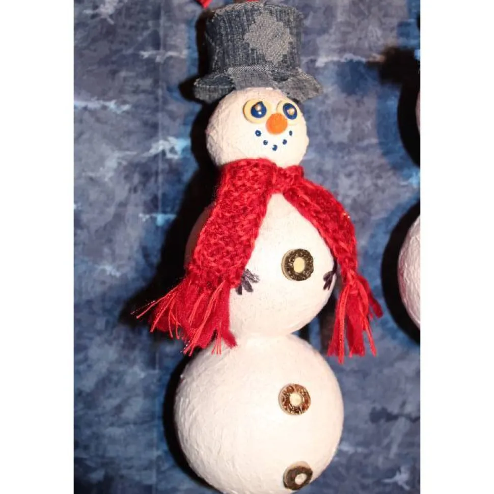Mit diesen witzigen Unikaten verwandelst Du jede Herbstdeko in ein echtes Highlight. Das Schneemann-Set besteht aus zwei Schneemännern mit je 3 Kunststoffkugeln gestaltet. Die Figuren sind liebevoll mit Papier und handgestrickten Accessoires dekoriert, sowie mit Acrylfarben bemalt. Beide Schneemänner sind mit Glitter, Knöpfen und Wolle dekoriert. Ein Zylinder aus Jeansstoff verziert das Köpfchen.