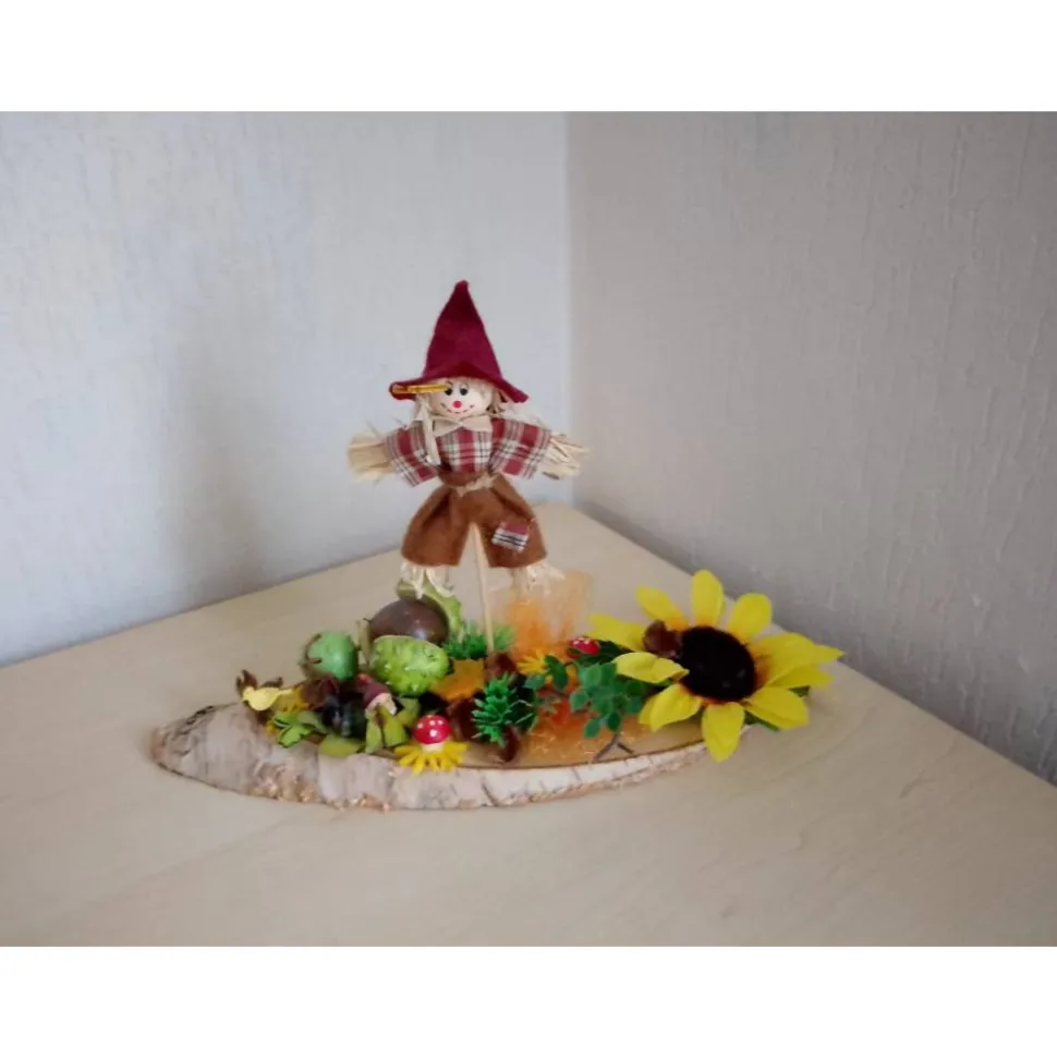 Im Mittelpunkt sitzt eine fröhliche Vogelscheuche zwischen Unterholz, Moos und herbstlichen Früchten wie Pilzen und Bucheckern. Ein kleiner Gartenzwerg sorgt für ein weiteres Highlight und macht die Szene perfekt für das Erntedankfest oder als Herbstdeko im Innen- und Außenbereich.
