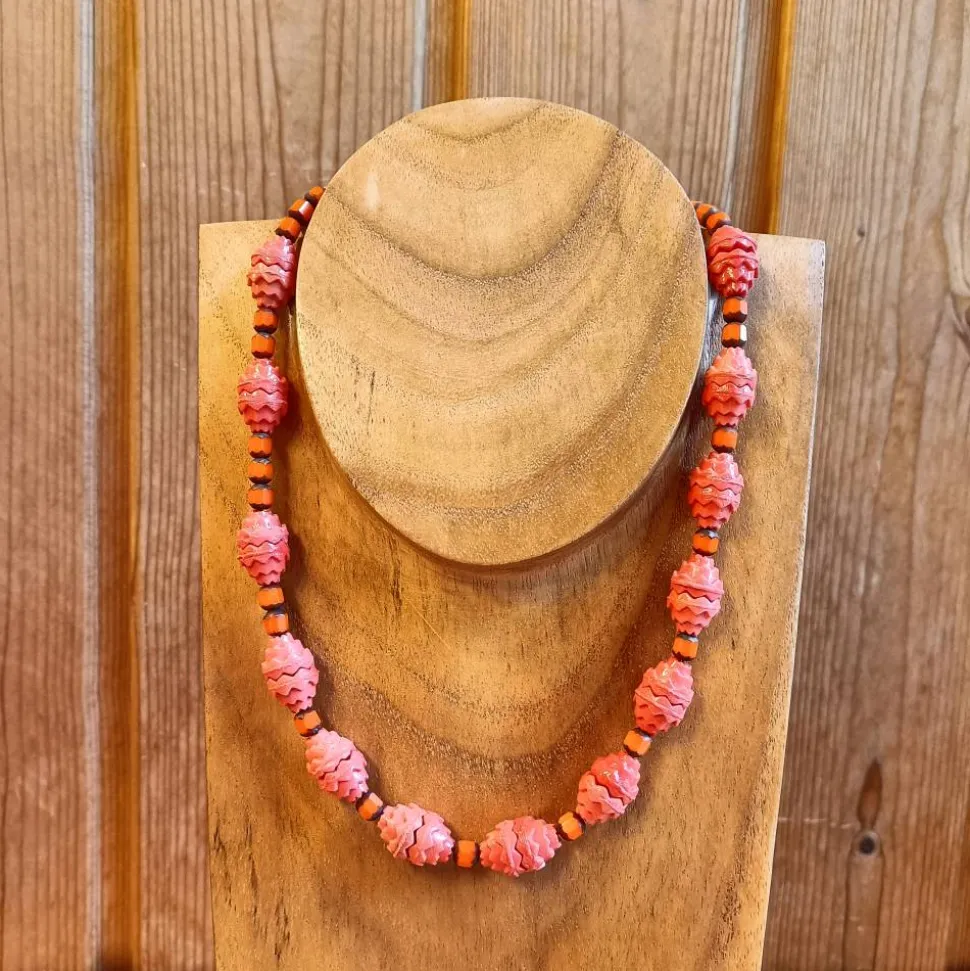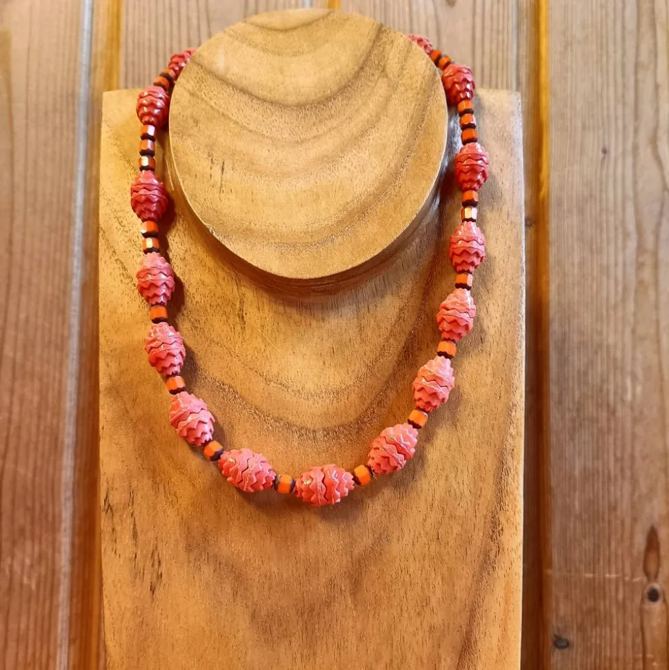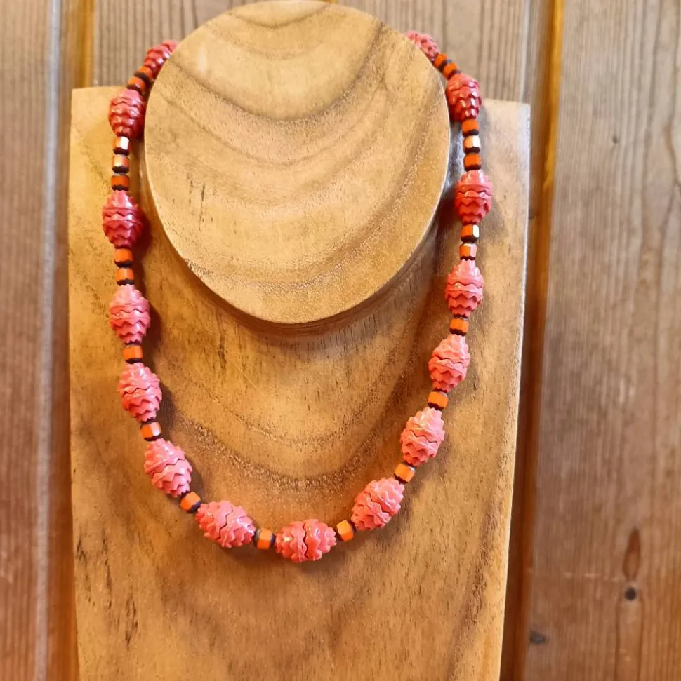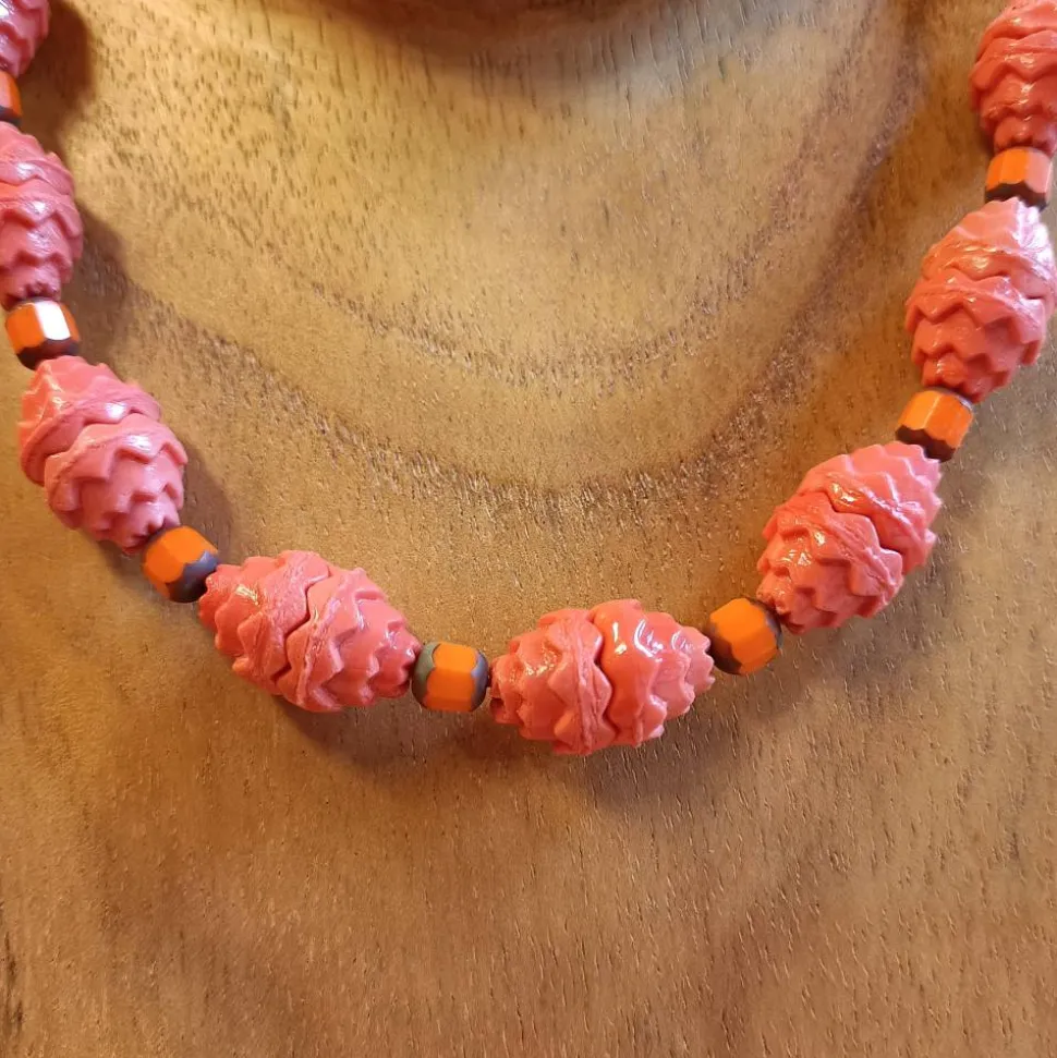 Eine Vintage-Kette aus ganz besonderen orange-farbigen Glasperlen: Je zwei der ungewöhnlichen, alten böhmischen Glasperlen aus den 1920er und 1930er Jahren weisen einen satten opaken Rot-Orange-Ton auf. Mit gezacktem Mustern und gezackten Rändern fügen sich je zwei davon zu einem Lampion von etwa 16 Millimetern Länge. Diese Glasperlen weisen altersbedingte Spuren auf, da sie fast 100 Jahre alt sind, sie wurden aber noch nie getragen, sondern stammen aus wiedergefundenen Lagerbeständen.