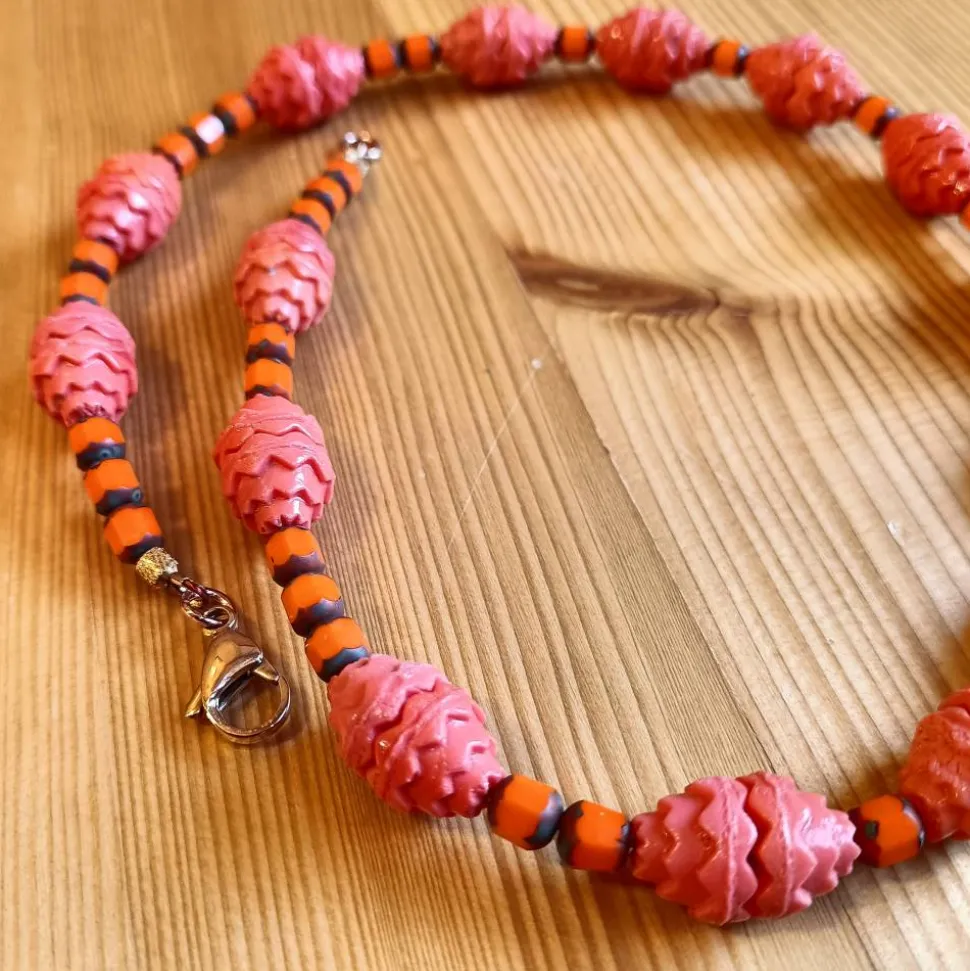 Dazwischen sitzen geschliffene Glasperlen, die man auch „lampion beads“ (ca. 6/5mm) nennt, in einem rot-opaken Ton mit braunem Picasso Finish. Das bedeutet, bei den ursprünglich braun überzogenen Glasperlen wurde der braune Überzug im Mittelteil abgeschliffen, so dass außen ein brauner Rand als Kontrast zu dem Orange entstand.