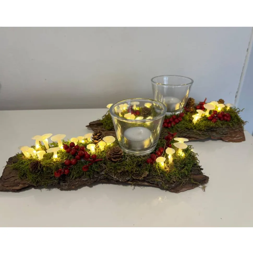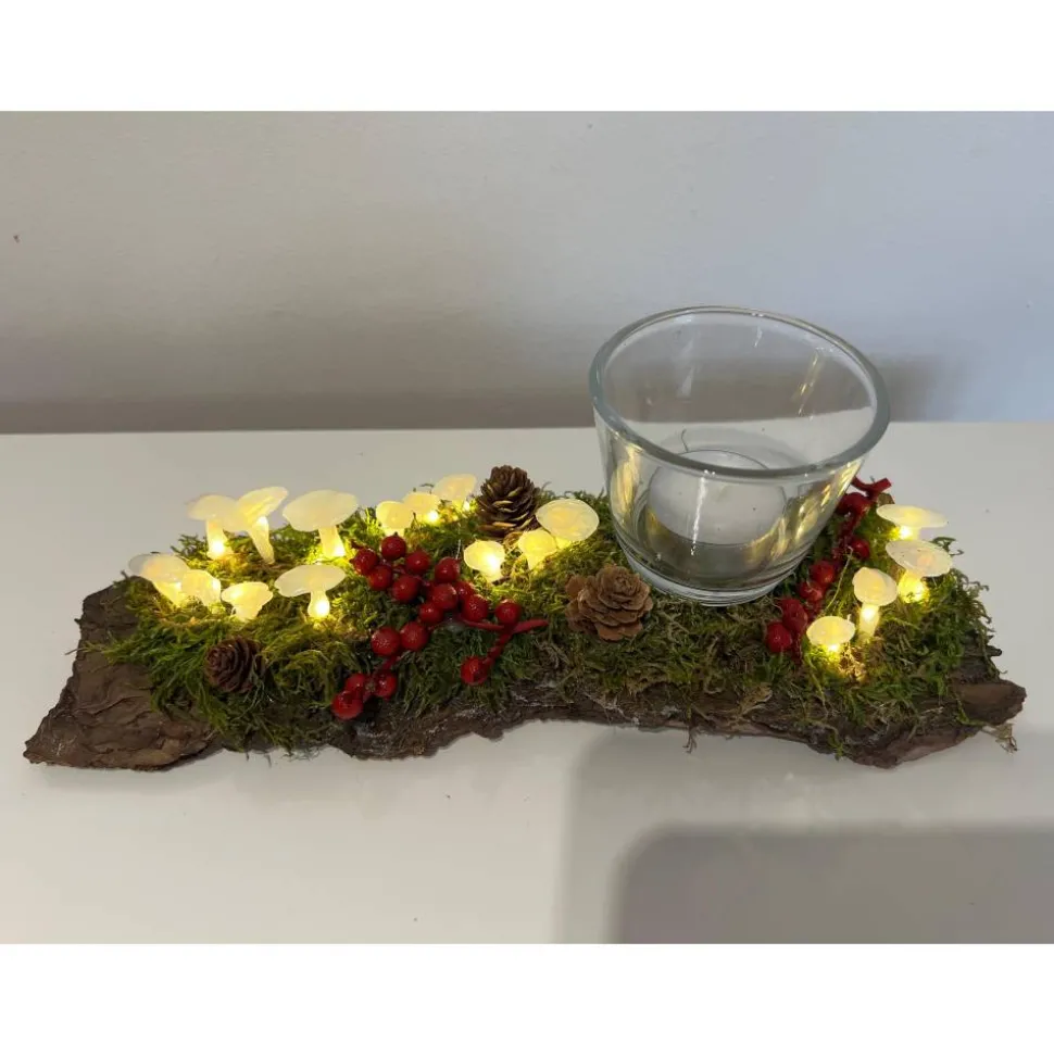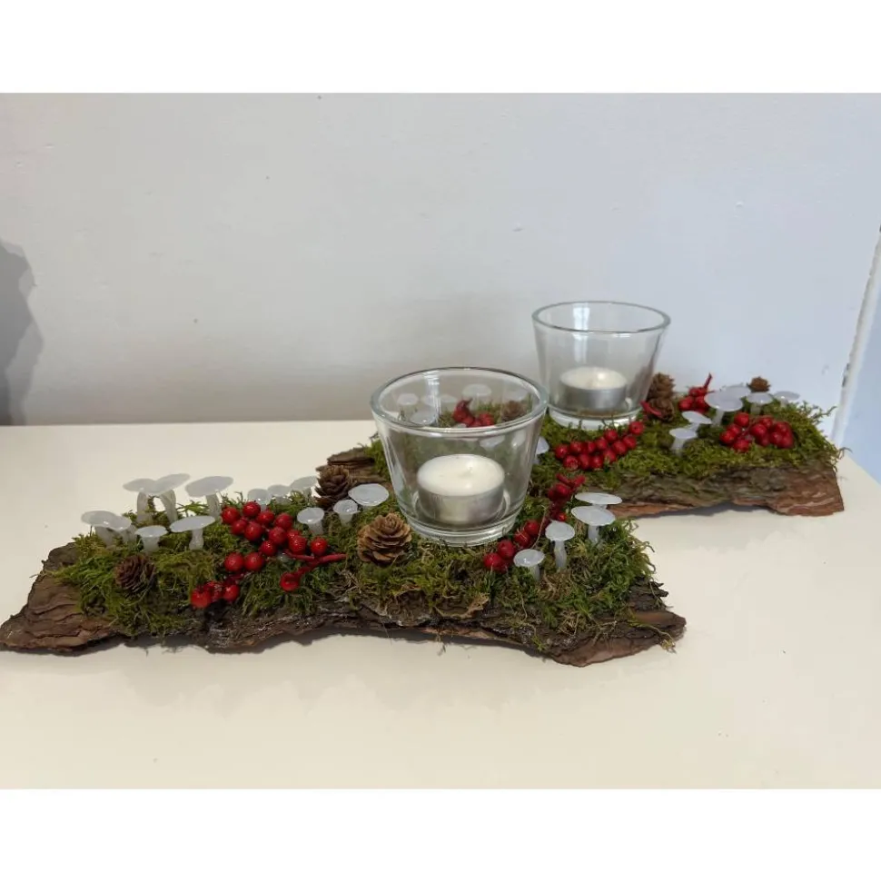 Hier verkaufe ich wunderschöne Herbstgestecke auf einer Baumrinde mit Ledpilze, die ich mit sehr viel Liebe zum Detail selbst hergestellt habe 🙂