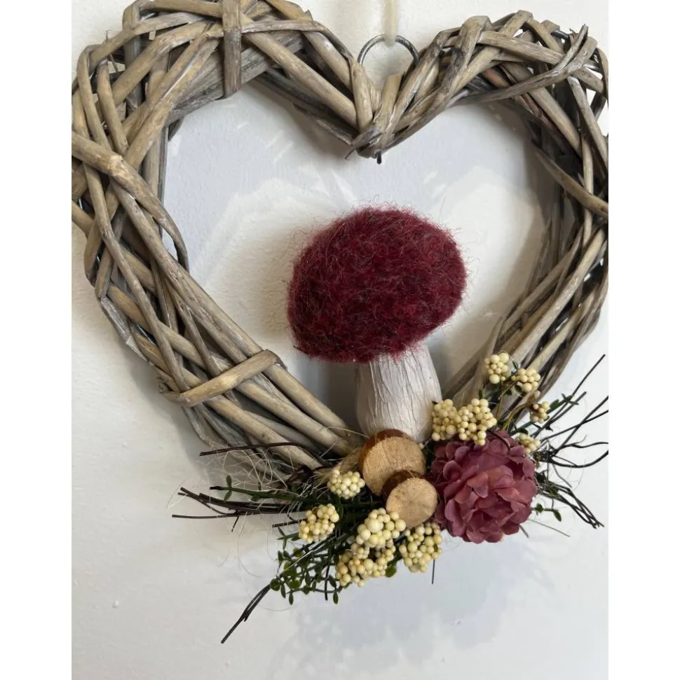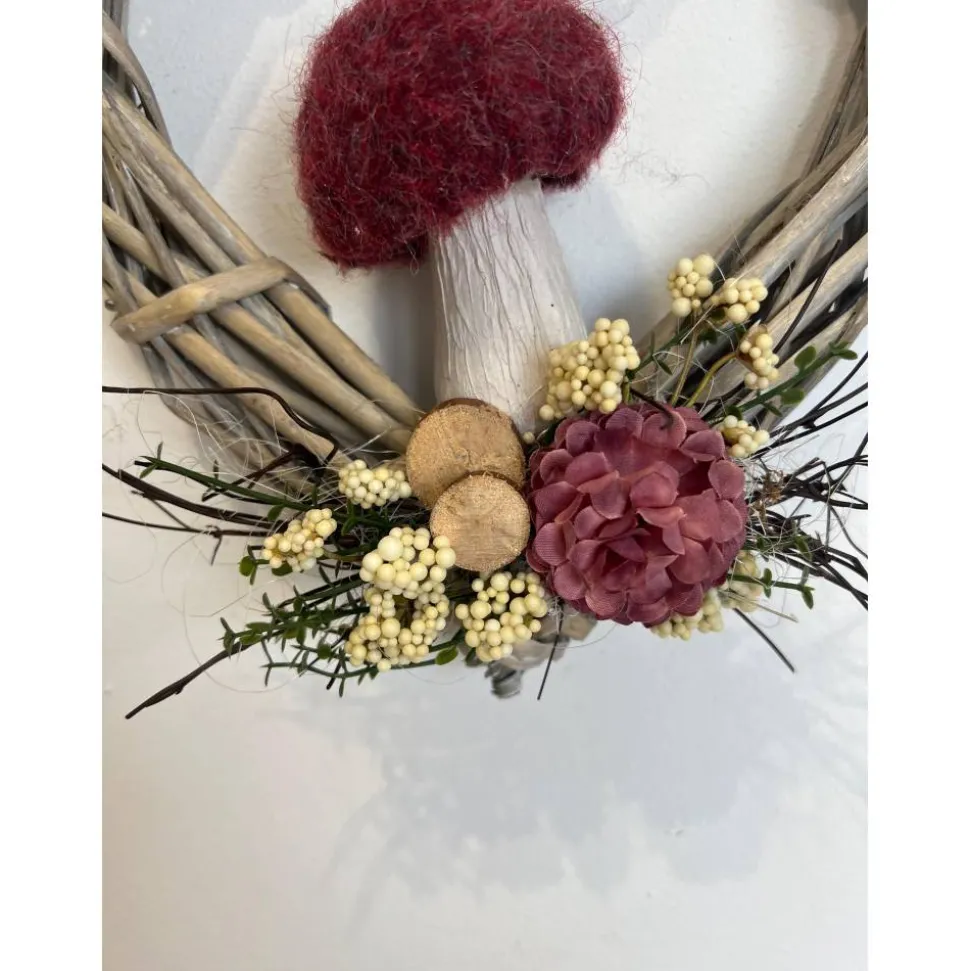 Der schöne Kranz ist mit einem Pilz und verschiedener Herbstdeko verziert und mit ganz viel Liebe zum Detail selbst hergestellt 🙂