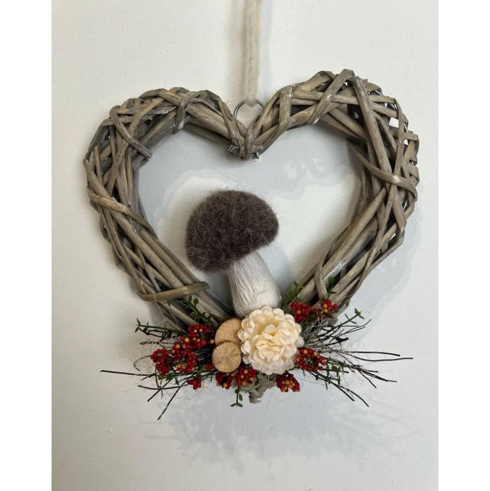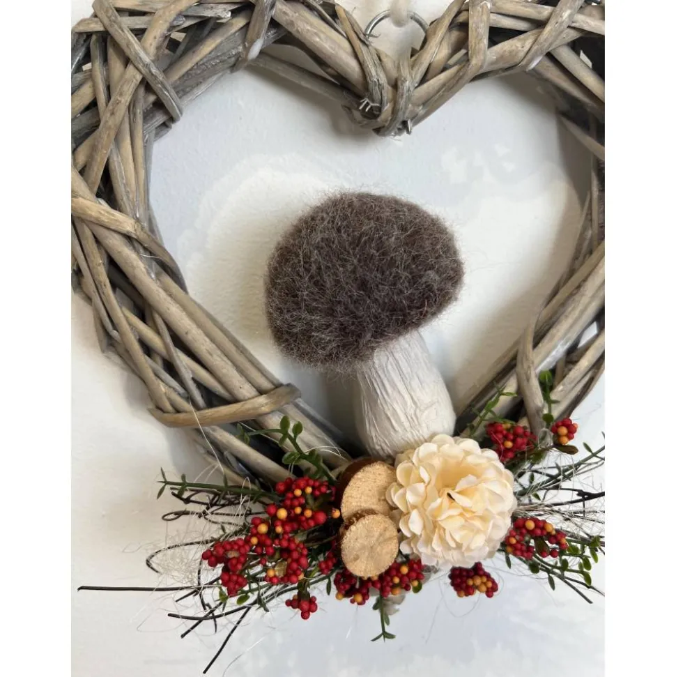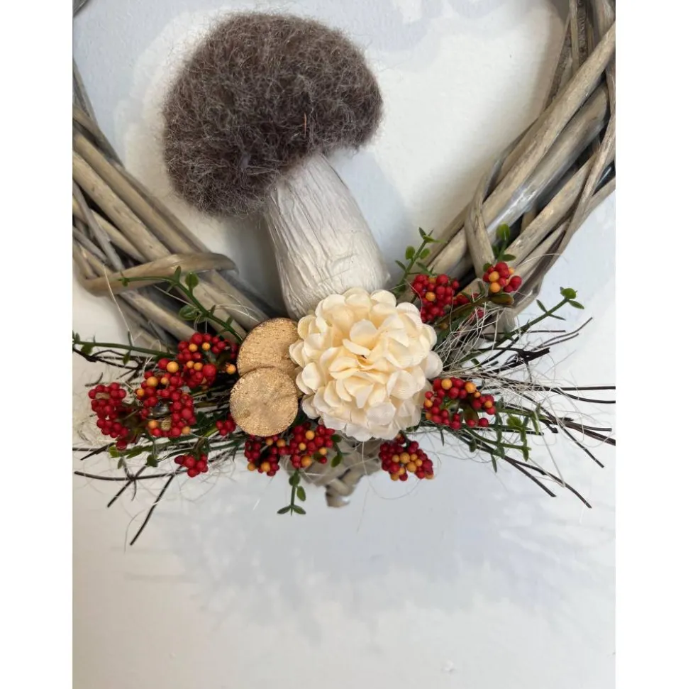Der schöne Kranz ist mit einem Pilz und verschiedener Herbstdeko verziert und mit ganz viel Liebe zum Detail selbst hergestellt 🙂