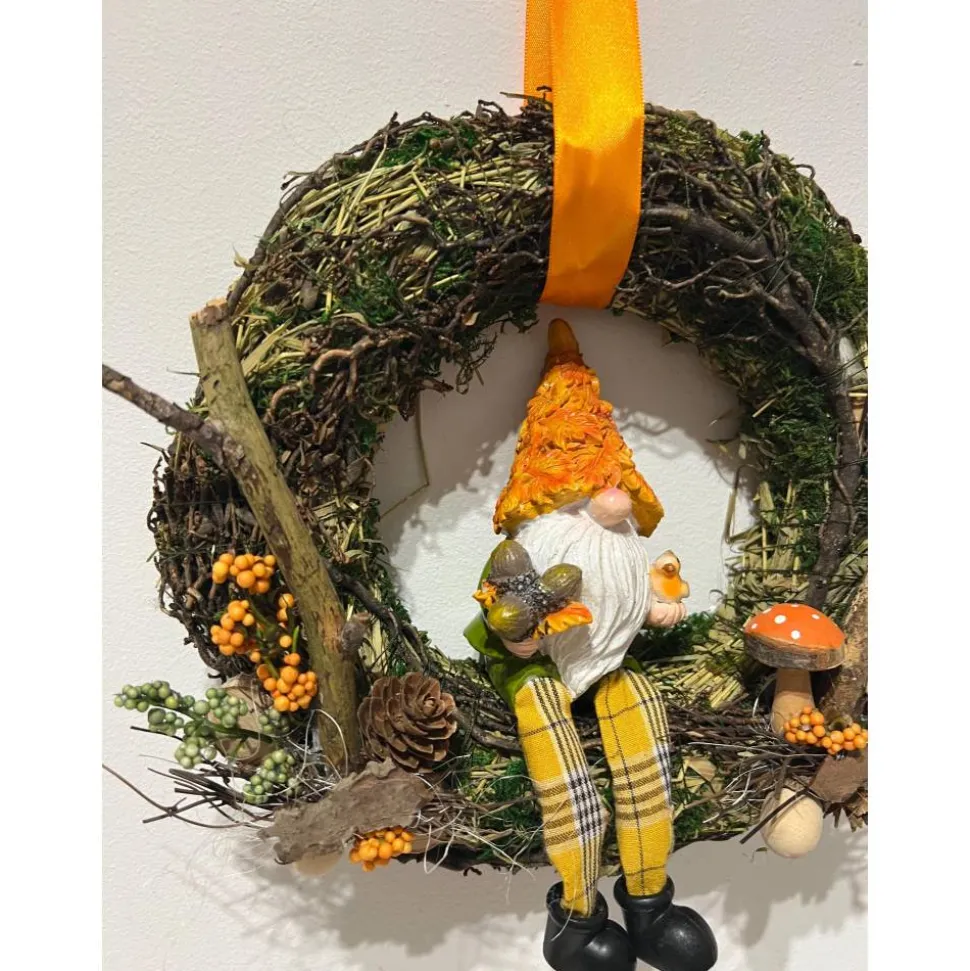 Der schöne Kranz ist mit einem Wichtel und verschiedener Herbstdeko verziert und mit ganz viel Liebe zum Detail selbst hergestellt 🙂