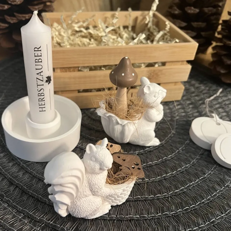 ° Zwei kleine dekorierte Eichhörnchen, detailverliebt gefertigt und ideal als herbstliche Tisch- oder Fensterbankdeko.