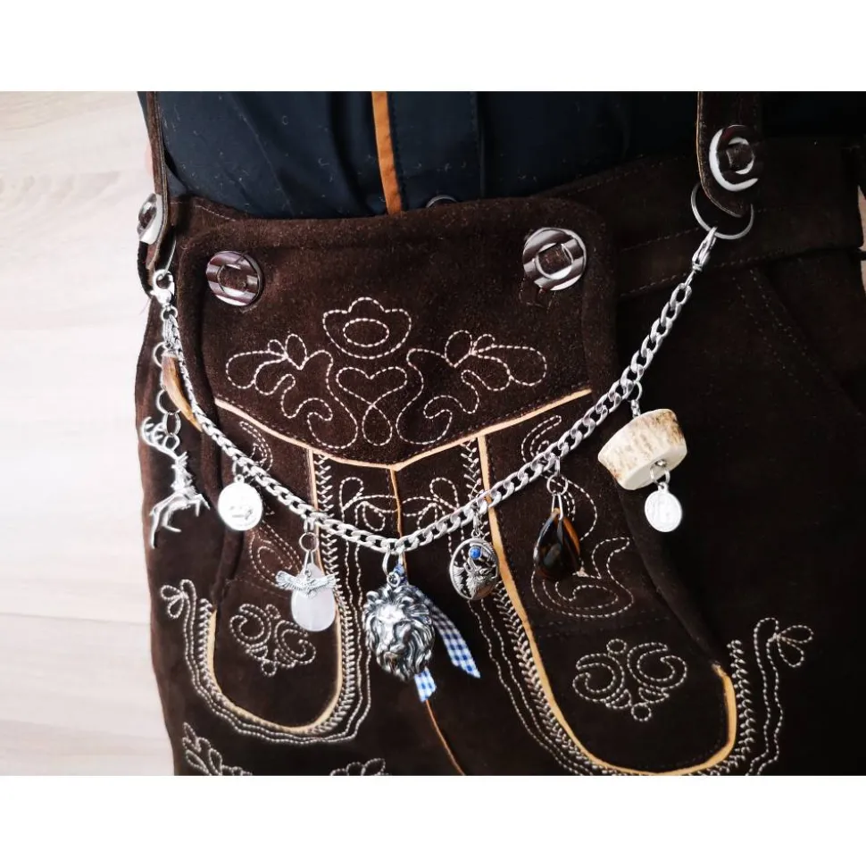 Dieses imposante Charivari ist einmalig gefertigt und lässt sich wunderbar zur Lederhose tragen. Es wird an den Gürtelschlaufen oder an den Hosenträgerknöpfen eingehakt ( hier werden 2 Ringe mitgeliefert).