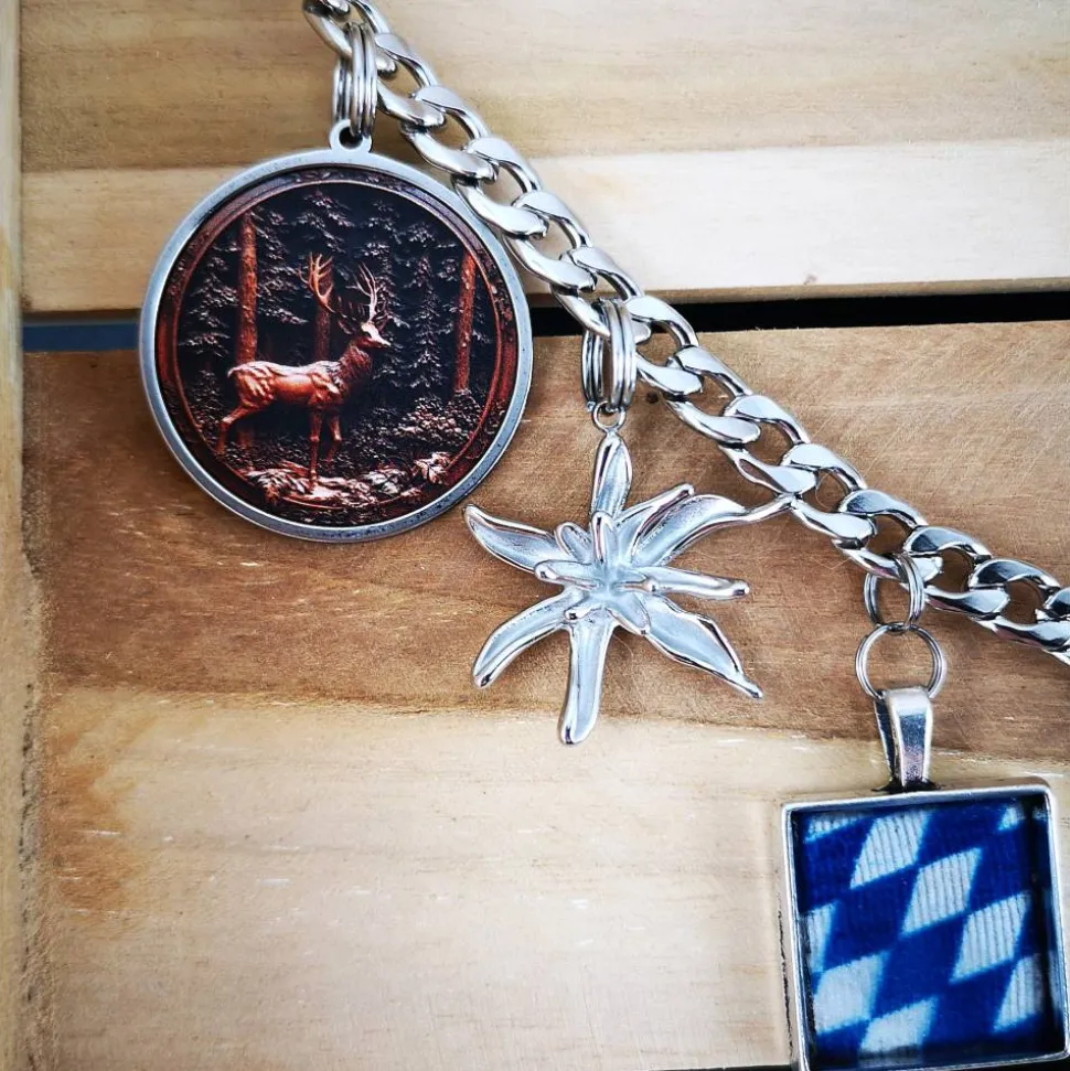 Falls du das Charivari erweitern möchtest, bieten wir Anhänger auch separat an. Bitte beachte, dass aufgrund der Verwendung von Naturprodukten wie Horn und Stein Variationen in Größe, Form und Farbe auftreten können, was jedes Stück zu einem einzigartigen Unikat macht.