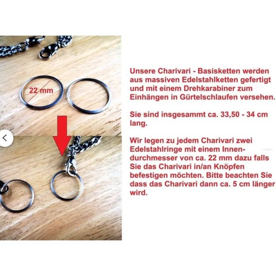 Da Naturprodukte wie Horn und Stein in den Charivaris verwendet werden, kann es zu Abweichungen in Größe, Form und Farbe kommen, was jedes Stück zu einem Unikat macht.
