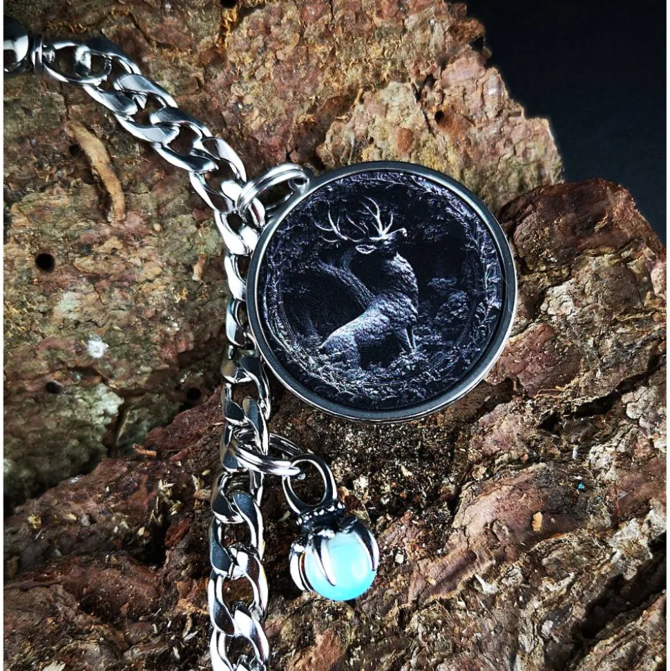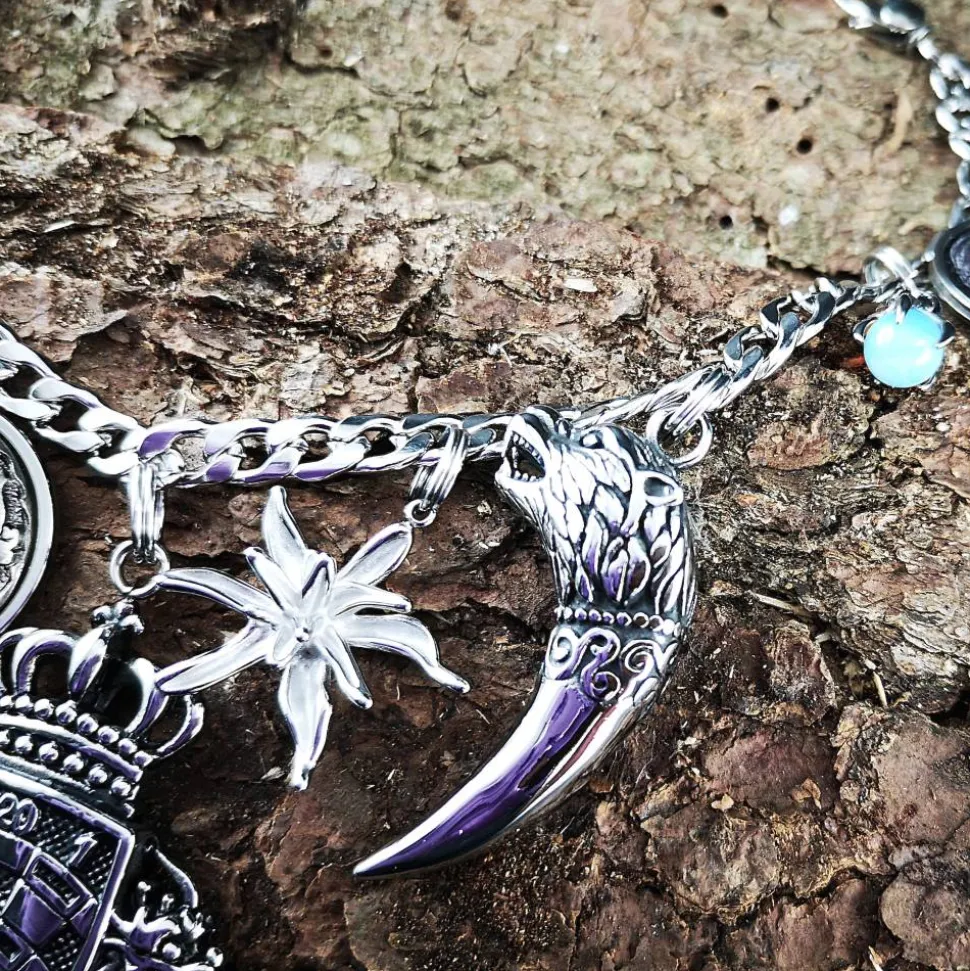 Es besteht aus Halbedelsteinen in Krallen, Anhängern mit 2D- Metallcabochons und massiven Edelstahlanhängern.