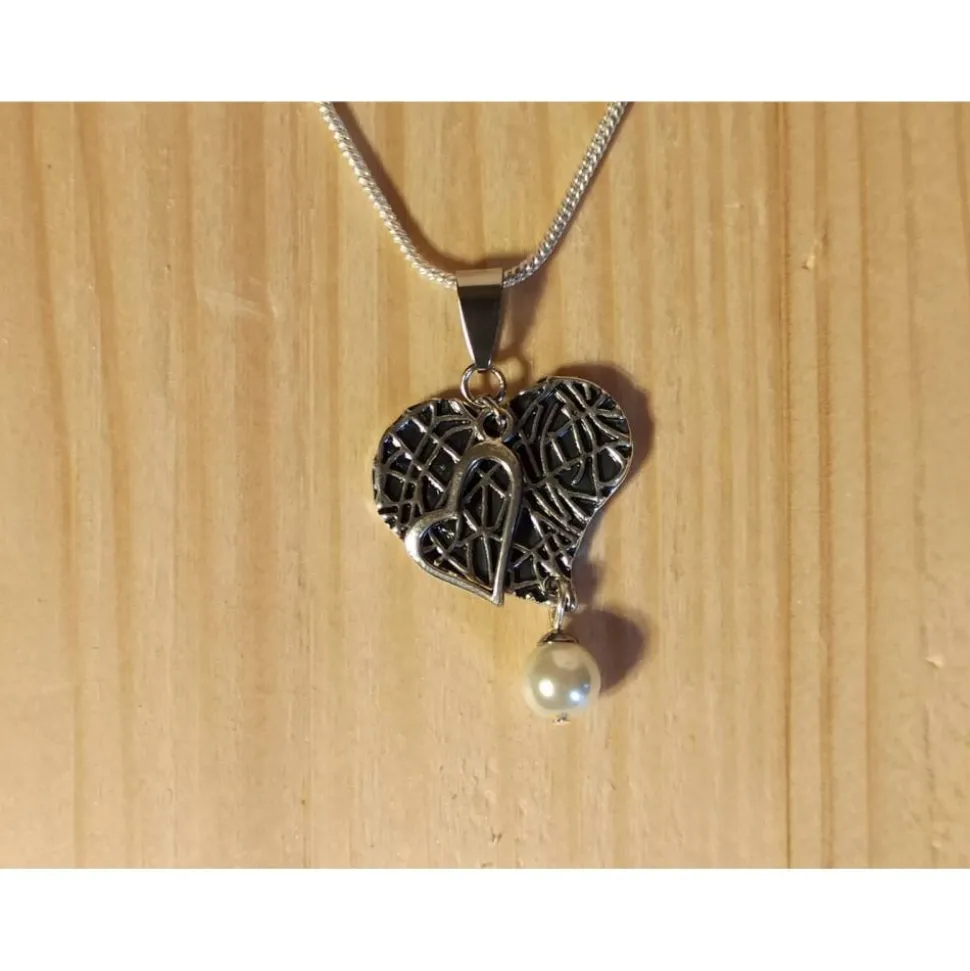 Der große Herzanhänger misst ca. 35x25mm und ist aus hochwertigem Tibetsilber gefertigt. Ein kleineres Herz sowie eine baumelnde Süßwasser-Zuchtperle ergänzen das liebevolle Design.