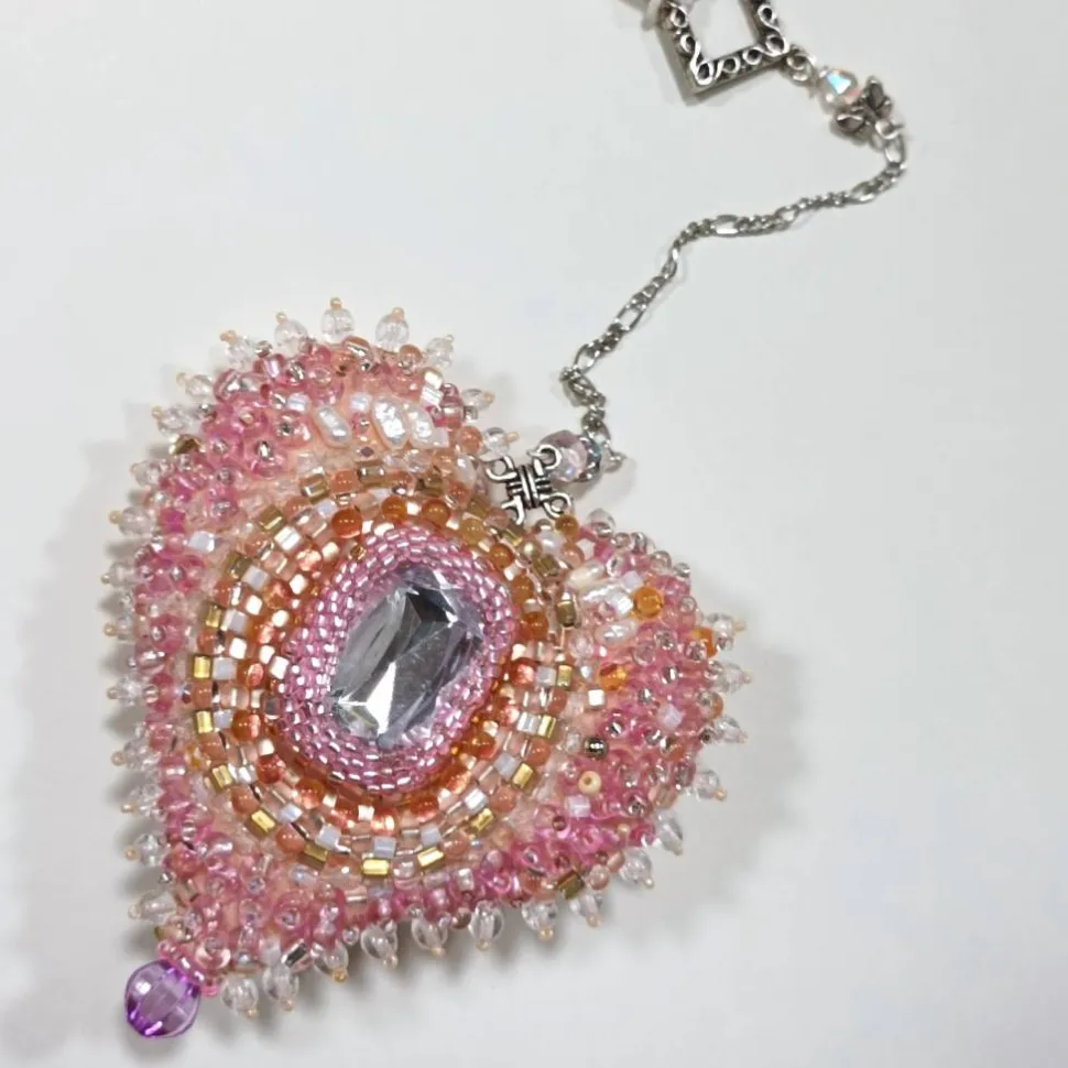 Herz mit facettiertem Glasstein auf lachs rosa ca. 8 cm x 8 cm, ca. 2 cm hoch, Gesamtlänge mit Kettchen ca. 24 cm Besonders hübsch ist der konturierte liebevoll handgestickte Rand aus kleinen Perlchen, der wirkt wie eine funkelnde Borte aus Knospen. Die mit mini chmetterling verzierte Kette zum Aufhängen verlieiht diesem Herz Ornament einen verspielten Charme.