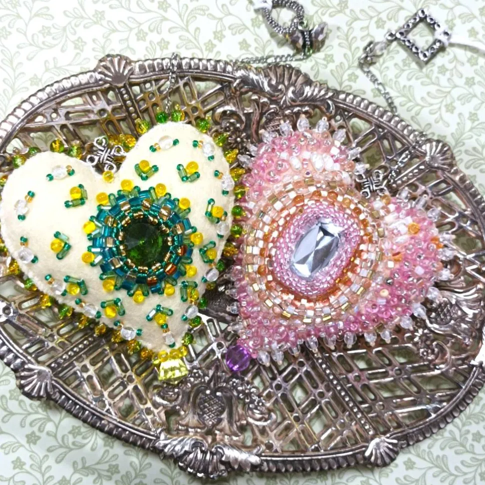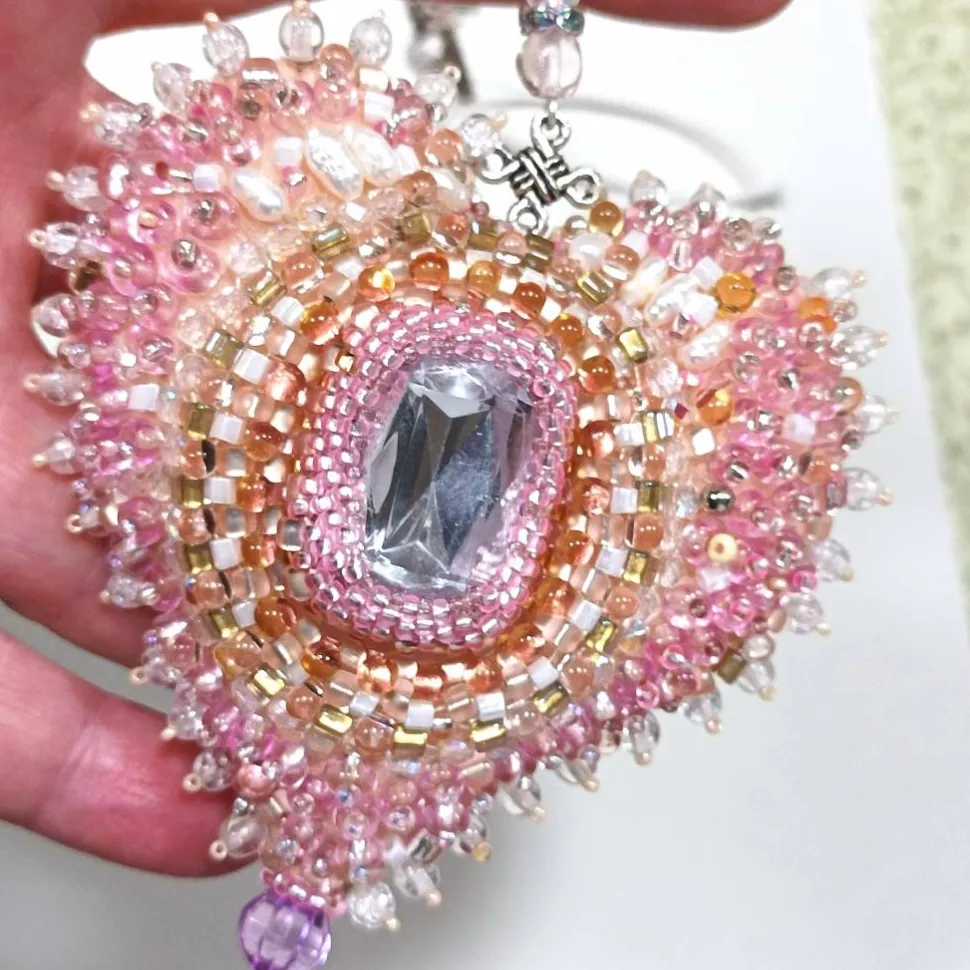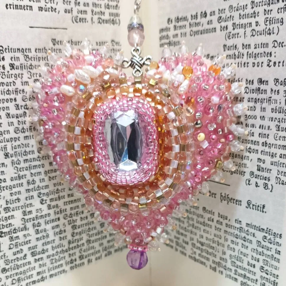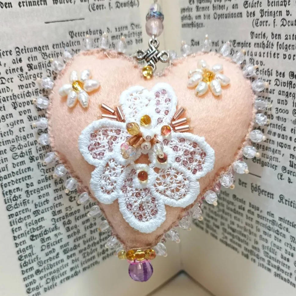 Pompös und doch mädchenhaft verspielt wirkt diese einzigartige Wohndeko handbestickt mit funkelnden Glasperlen um einen richtig großen Kristall: Nicht nur für Dekomäuse ist dieses Ornament mit dem Kristall als Klunker von 25 x 15 mm in zartem rosa ein schönes Geschenk mit Herz. Dieses handbestickte Herz Ornament als Unikat begeistert mit den verspielten Blüten aus Süßwasserzuchtperlen und zarter Spitze umspielt von Glasperlen in funkelnden rosa Tönen auf dem sanftem creme apricot lachs Farbton. Jedes Herz ist ein handgemachtes Einzelstück aus Deutschland und verleiht deinem Zuhause mit kunstvoller Perlenstickerei einen Hauch von Exklusivität.