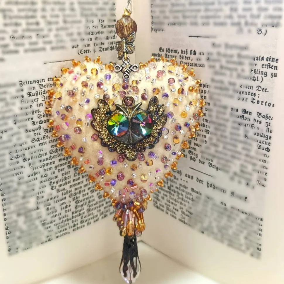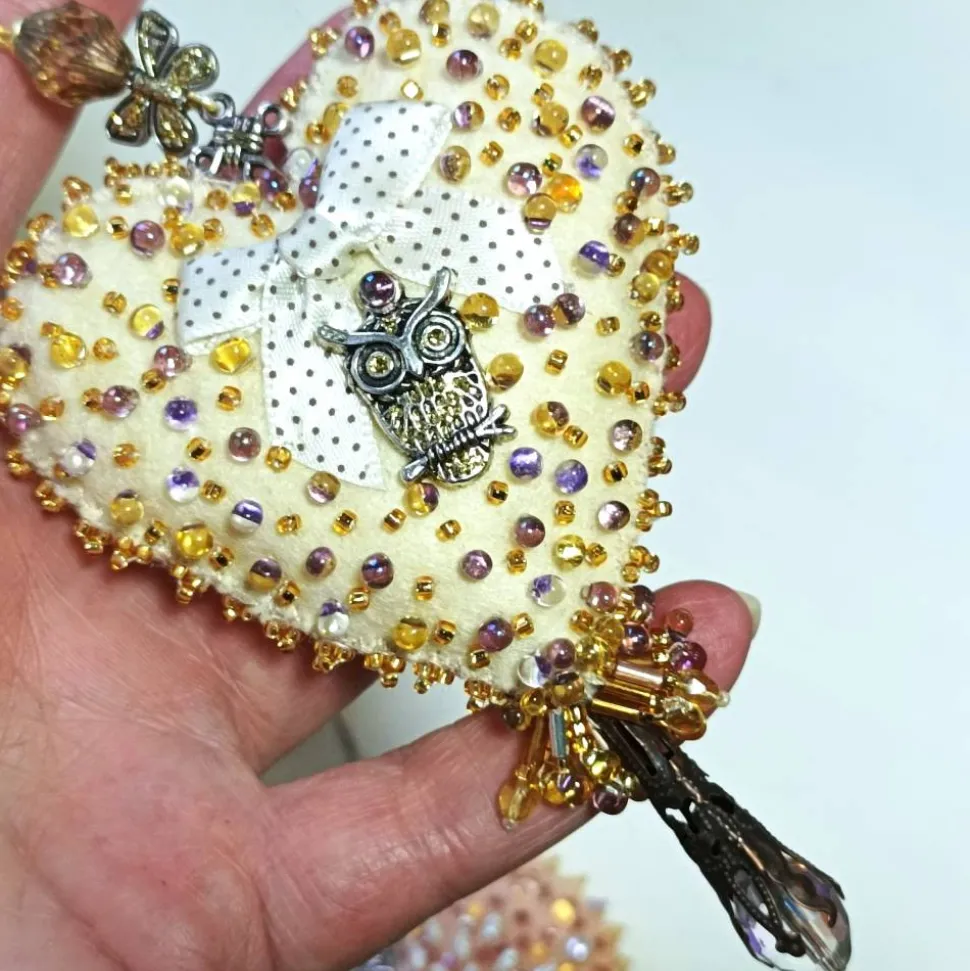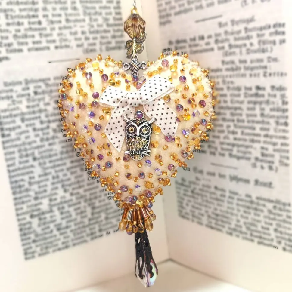 Die Rückseite des gepolsterten Herzen ist individuell mit Perlen um eine versilberte Eule gestaltet. So wird jedes Ornament zum dekorativen Highlight – ideal für Blumensträuße, Geburtstagen, Hochzeiten, Muttertag oder als Tischdeko zur Verlobung.
