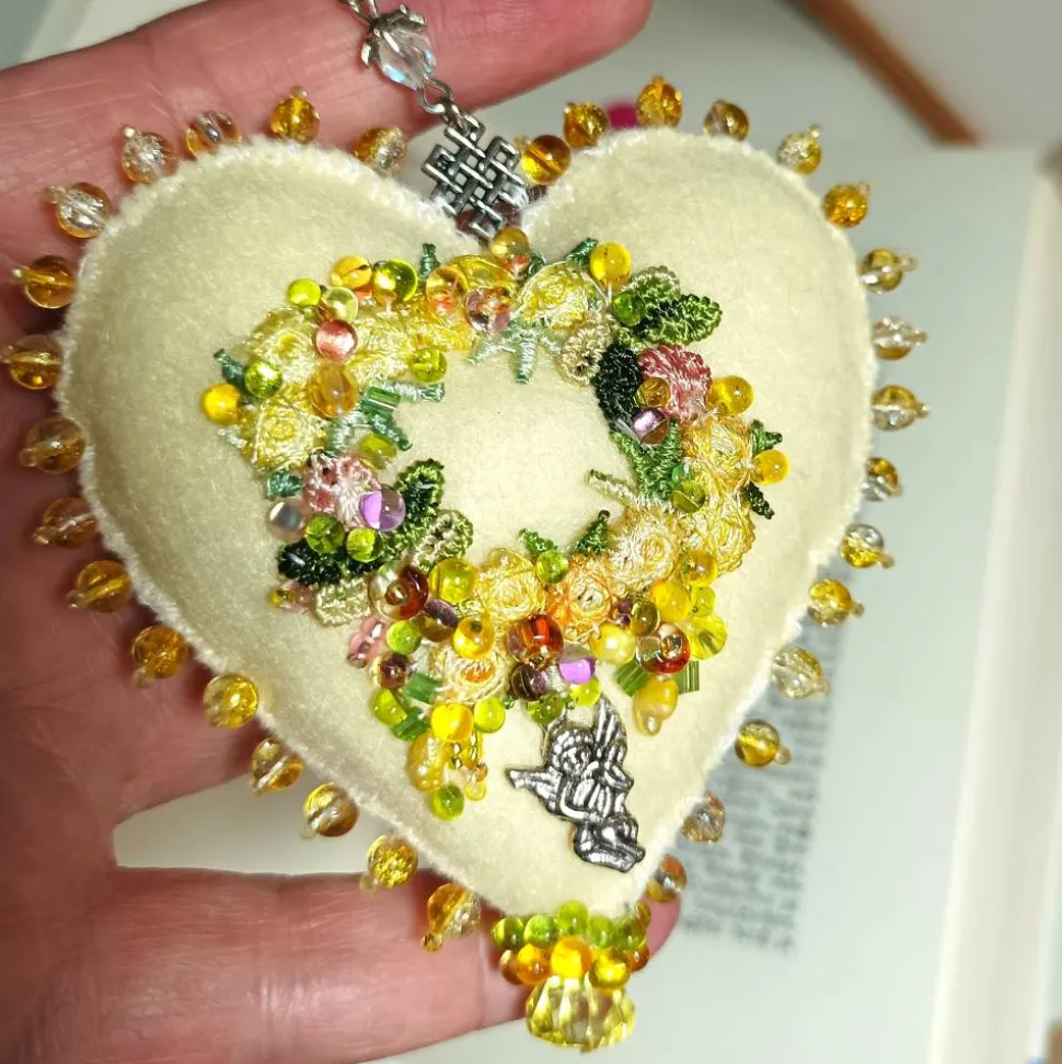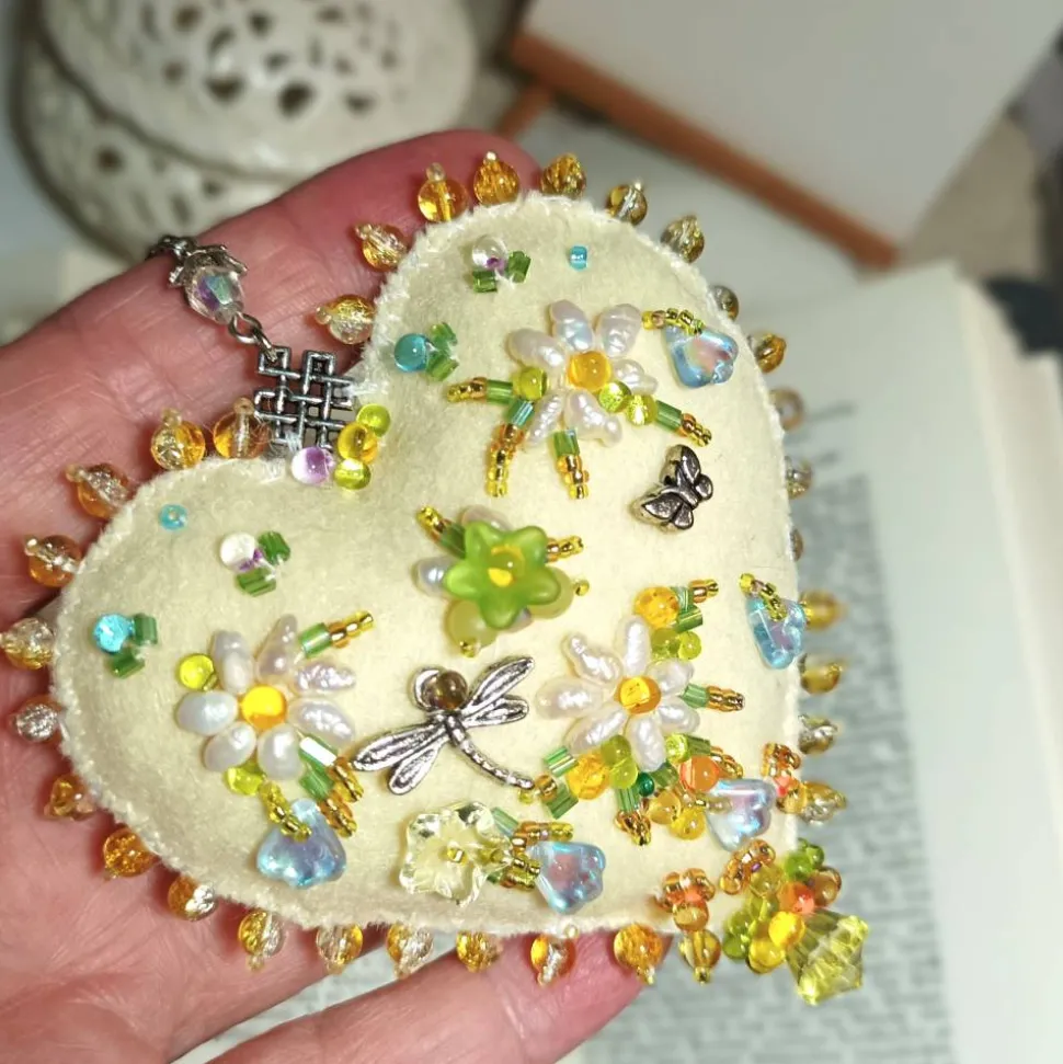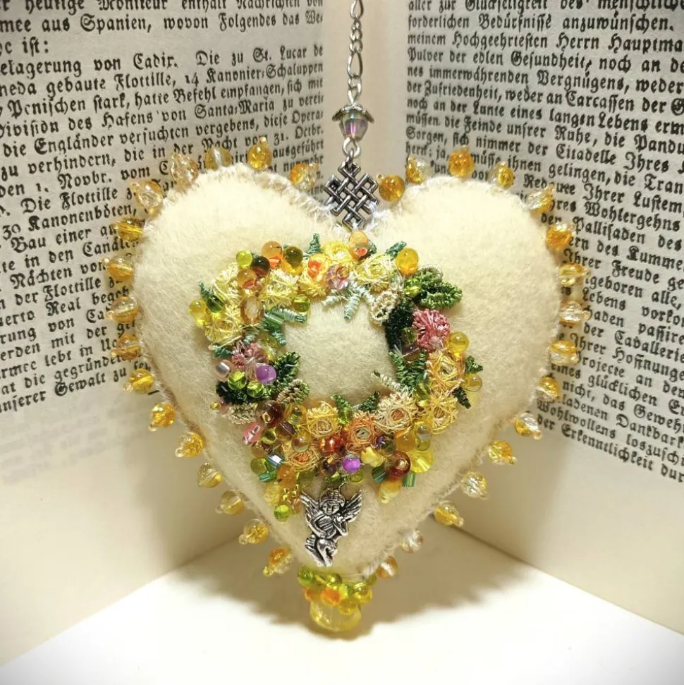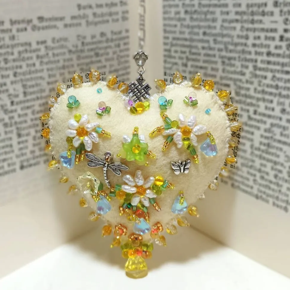 Frühlingsfrisch wirkt diese einzigartige Wohndeko handbestickt mit funkelnden Tropfenperlen und schimmernden Barockperlen an Blümchen: Nicht nur für Dekomäuse ist dieses Ornament mit dem Blütenkranz und Engelchen auf einer und den Streublümchen aus Barockperlen sowie Mini Schmetterling und Libelle auf der anderen Seite ein schönes Geschenk mit Herz. Dieses handbestickte Herz Ornament als Unikat begeistert mit den verspielten Blüten wie stilisierte kleine Gänseblümchen umspielt von Glasperlen auf dem sanftem creme vanille gelb Farbton. Jedes Herz ist ein handgemachtes Einzelstück aus Deutschland und verleiht deinem Zuhause mit kunstvoller Perlenstickerei einen Hauch von Exklusivität.