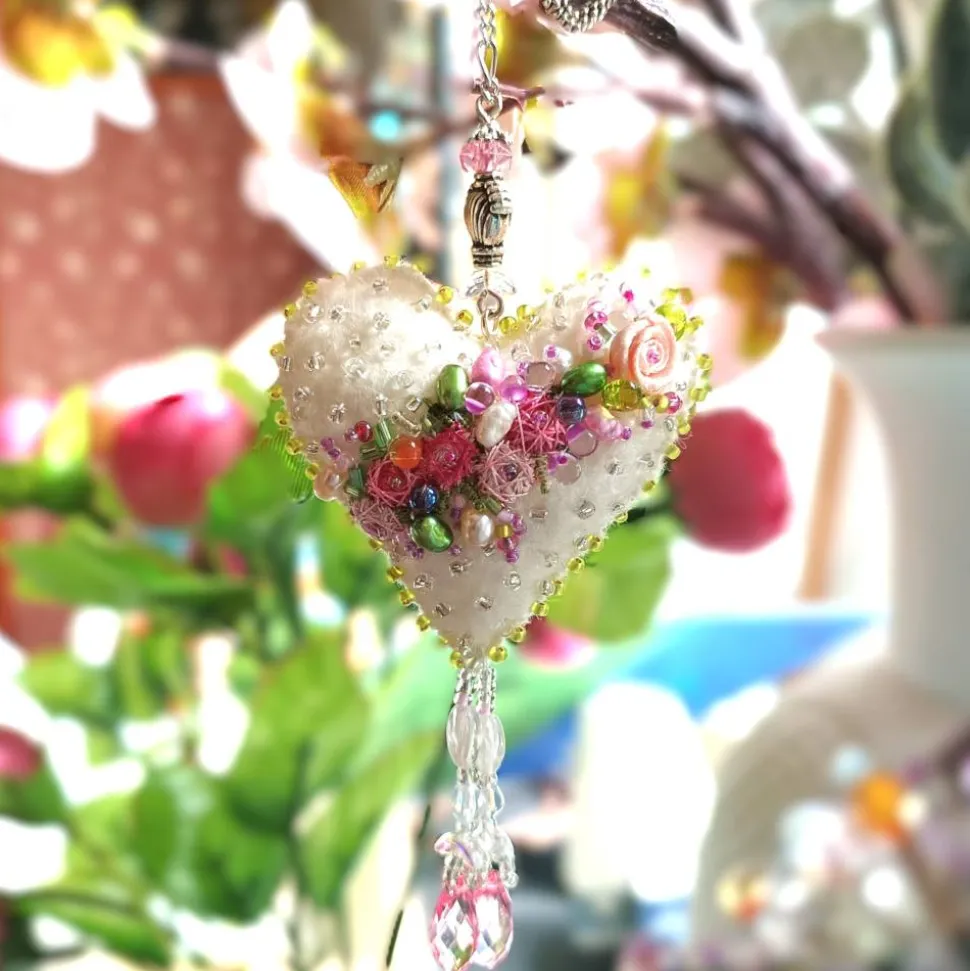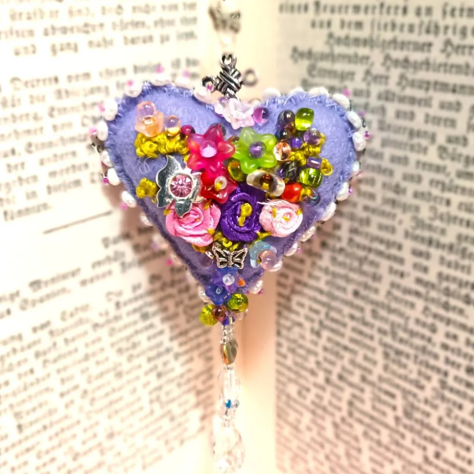Herz mit Blüten und den Streublümchen auf lila flieder ca 5 cm x 5 cm, ca. 2 cm hoch, Gesamtlänge mit Kettchen ca. 18 cm. Besonders hübsch ist der konturierte liebevoll handgestickte Rand aus kleinen Perlchen. Die mit einem Herz verzierte Kette zum Aufhängen verlieiht diesem Herz Ornament einen spielerischen Charme.Beide Seiten des gepolsterten Herzen sind individuell mit Perlen gestaltet. So wird jedes Ornament zum dekorativen Highlight – ideal für Blumensträuße und Gestecke zu Geburtstagen, Hochzeiten, zum Muttertag oder als Tischdeko zur Verlobung.