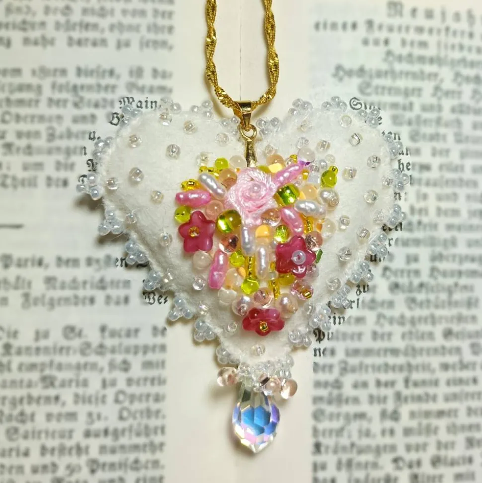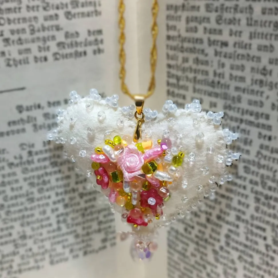 Das Herz-Design ist dreidimensional gestaltet und erinnert an einen Mini-Brautstrauß auf einem Untergrund aus Filz, verziert mit erhöhten Perlen wie Knospen in pastell und mit schimmernden Barockperlen in apricot.. Der eingearbeitete Tropfen an der Herzspitze sorgt für zusätzliche Lichteffekte und macht den Schmuck lebendig und besonders.