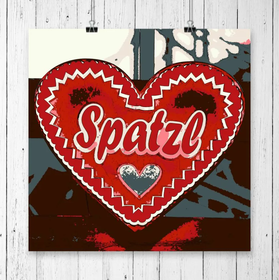 Nicht nur zum Oktoberfest darfst du deinem Schatzi (Lebkuchen)-Herzen schenken. Sag es ihr / ihm doch mal auf eine ganz originelle Art und Weise. Das Pop Art Print „SPATZL“ kommt bestimmt gut an!!