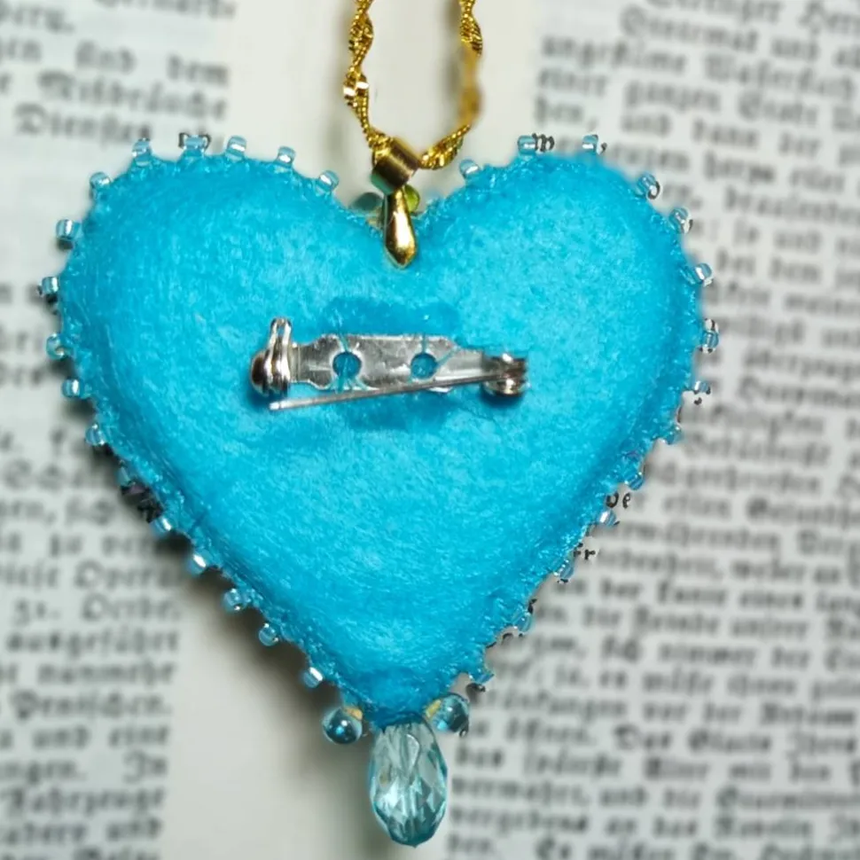 Das Herz misst etwa 5,5 x 5 Zentimeter und ist an einer etwa 42 cm langen, funkelnden gekordelten Kette eingehängt. Die Üppige Anhängerschlaufe ist ist auch teamfähig mit einer Kordel, Samt oder Satin als Band oder mit einer dünneren Lederschnur. Die vergoldete Kette kannst du mit einem Karabinerhaken schließen. Die Broschennadel ist silberfarben und hat einen Sicherheitsverschluß