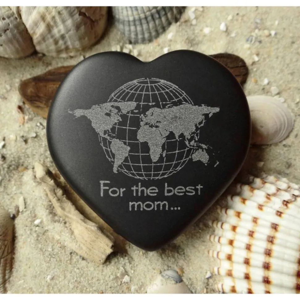 Alle Kontinente sowie eine Weltkugel sind hellgrau in die dunkle, matte Oberfläche des Basaltherzens graviert. Es symbolisiert alle Winkel der Himmelsrichtungen, in denen sich die Mutter Ihres Herzens befinden könnte. Auf der Vorderseite sind unter der Weltkarte die Worte For the best mom … graviert, während auf der Rückseite des Talismans … in the whole world folgt.