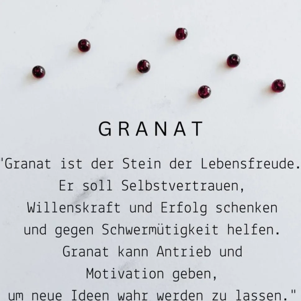 Granat ist der Stein der Lebensfreude. Er soll Selbstvertrauen, Willenskraft und Erfolg schenken und gegen Schwermütigkeit helfen. Granat kann Antrieb und Motivation geben, um neue Ideen wahr werden zu lassen.