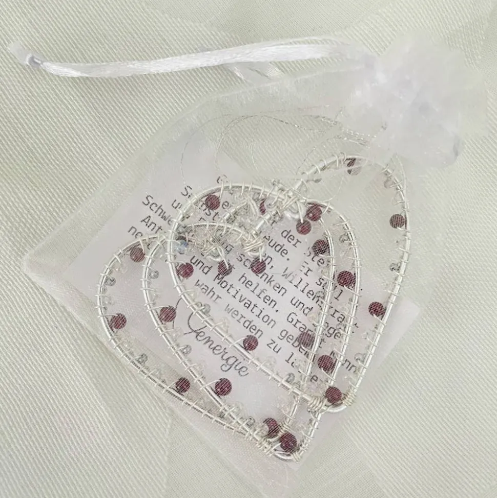 Jedes Herz ist in einem kleinen weißen Organzabeutel mit einem Zettel, auf dem die Wirkung des Steins beschrieben ist, verpackt. Mit einem bereits befestigten silberfarbenen Faden ist das Herz sofort bereit zum Aufhängen.