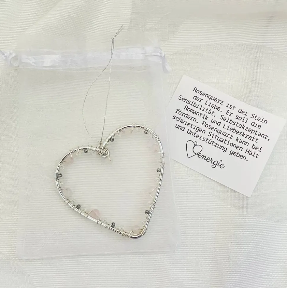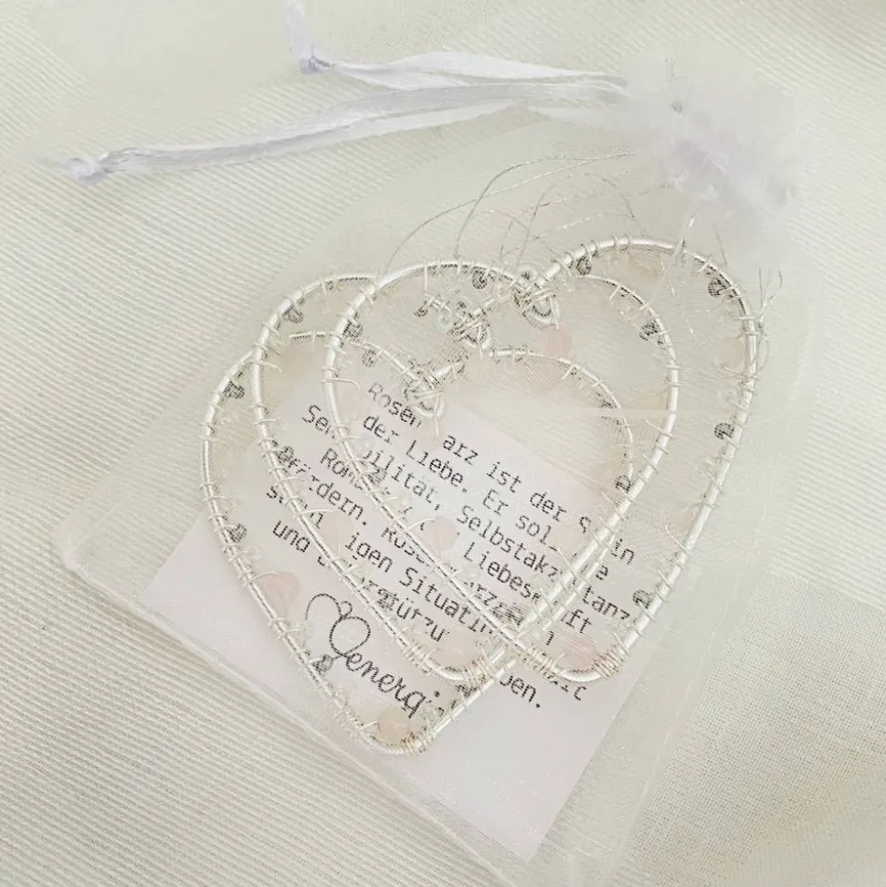 Jedes Herz ist in einem kleinen weißen Organzabeutel mit einem Zettel, auf dem die Wirkung des Steins beschrieben ist, verpackt. Mit einem bereits befestigten silberfarbenen Faden ist das Herz sofort bereit zum Aufhängen.