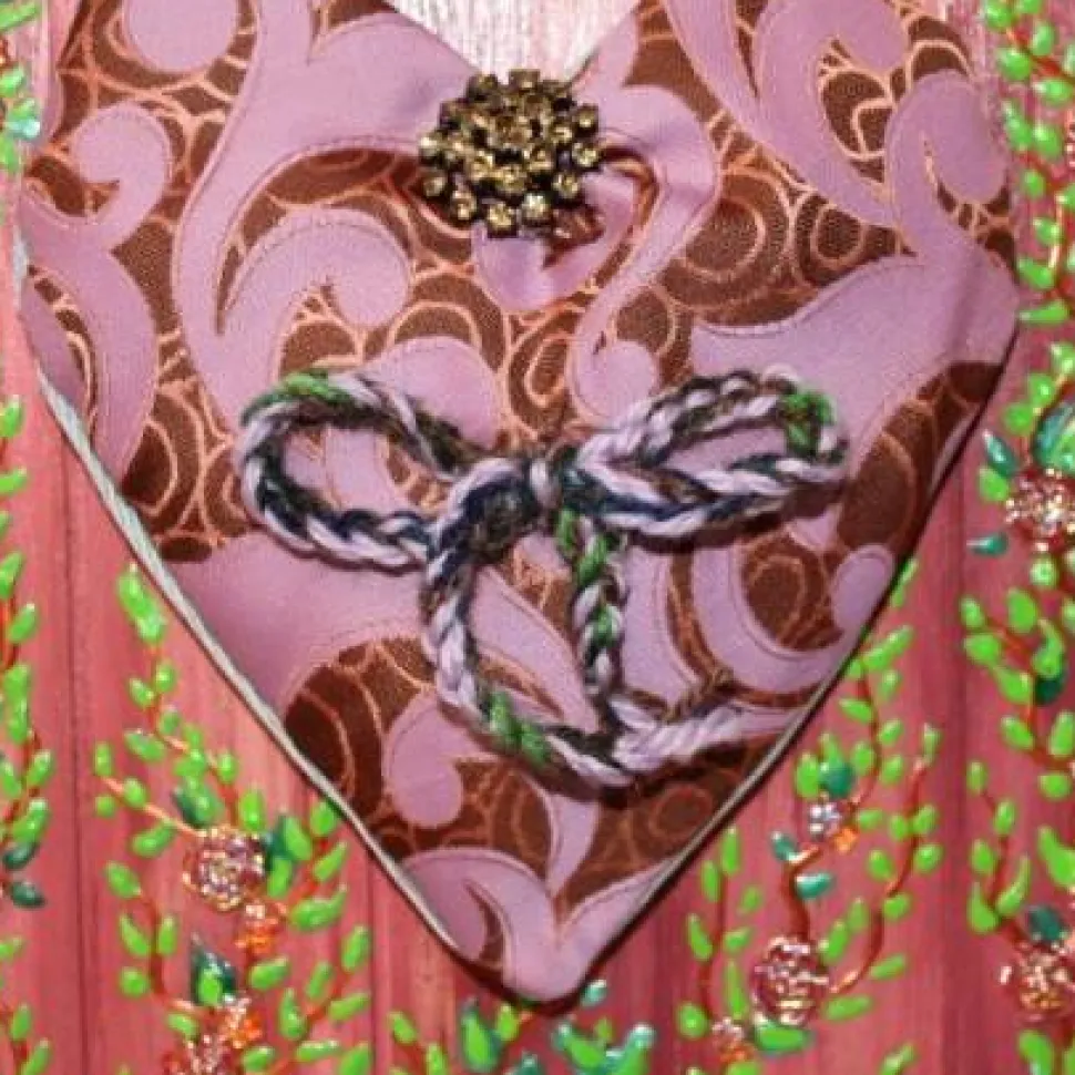 Das Handgenähte Herzkissen ist aus upgecyceltem Krawatten- und Jeansstoff genäht und mit einer herrlich glitzernden Brosche versehen.