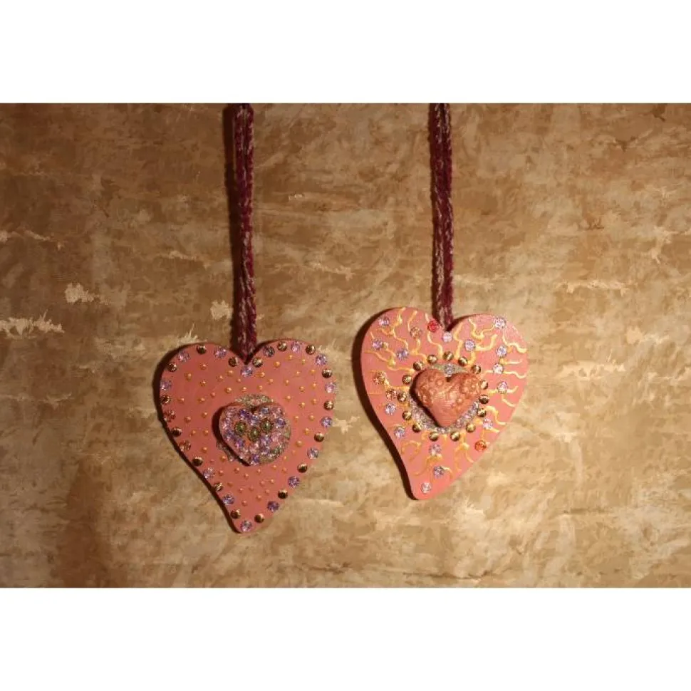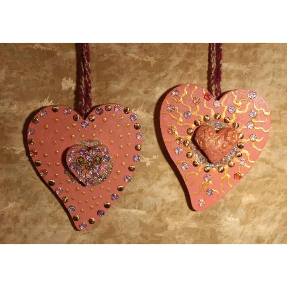 Die Herzen bestehen aus Holz, dekoriert mit unzähligen Schmucksteinen aus Kunststoff.und Metall.