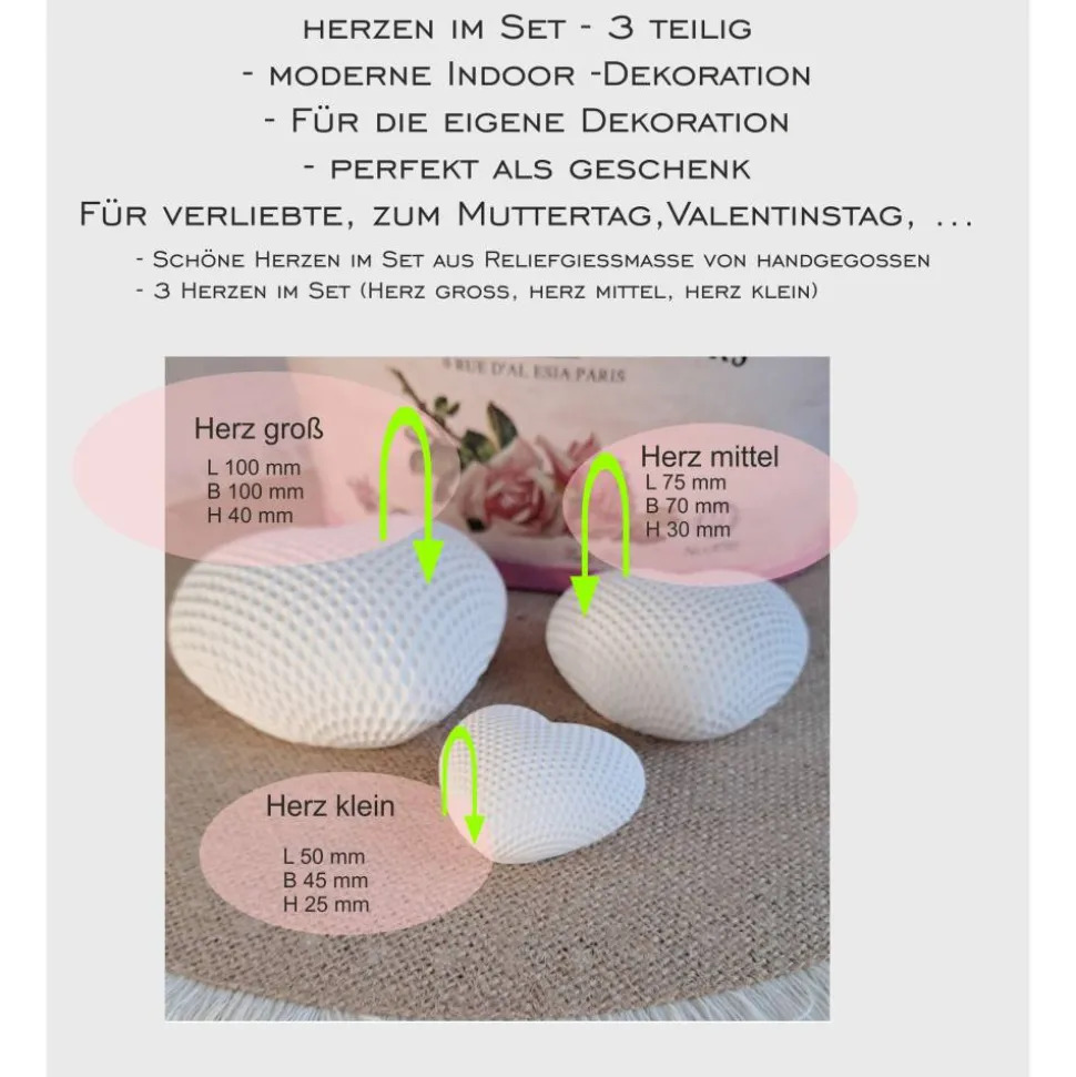 Die modernen Herzen mit ihrem Wabenmuster sind per Hand gegossen und vielseitig einsetzbar. Einzeln oder als Gruppe eine ansprechende Dekoration im eigenen Zuhause. Ideal als Geschenk zur Hochzeit, zum Valentinstag, zum Muttertag. Herzen stehen im Zeichen der Zuneigung und perfekt für die kleine Aufmerksamkeit an Ihre Lieben für zwischendurch.