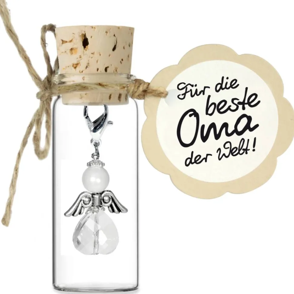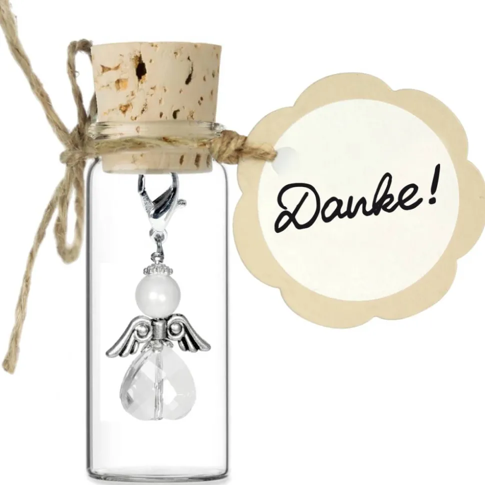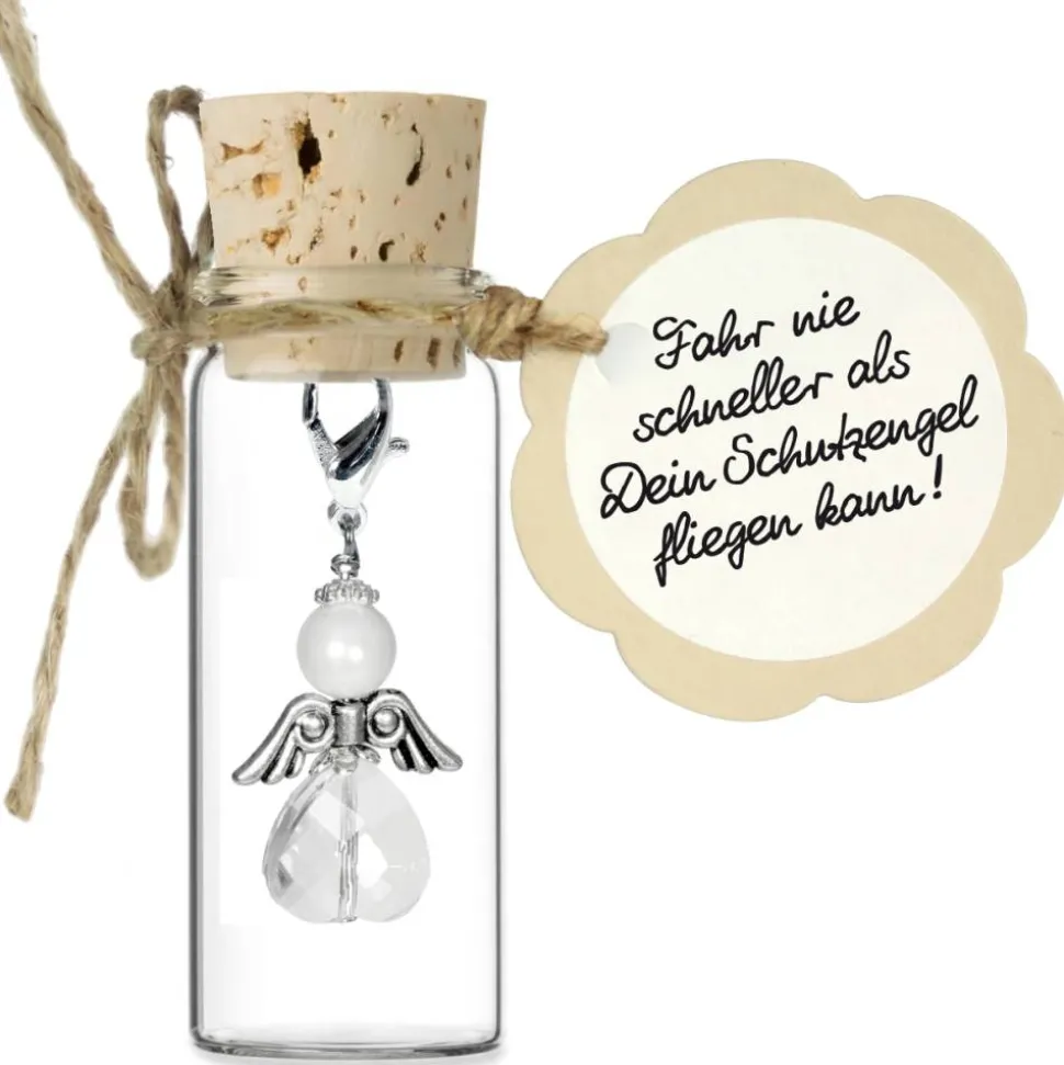 Der Engel-Anhänger wird liebevoll präsentiert in einem dekorativen Korkenglas mit beschrifteter Grußkarte. Ihr Geschenk ist somit direkt fertig zum Verschenken und wird sicherlich für strahlende Augen sorgen.