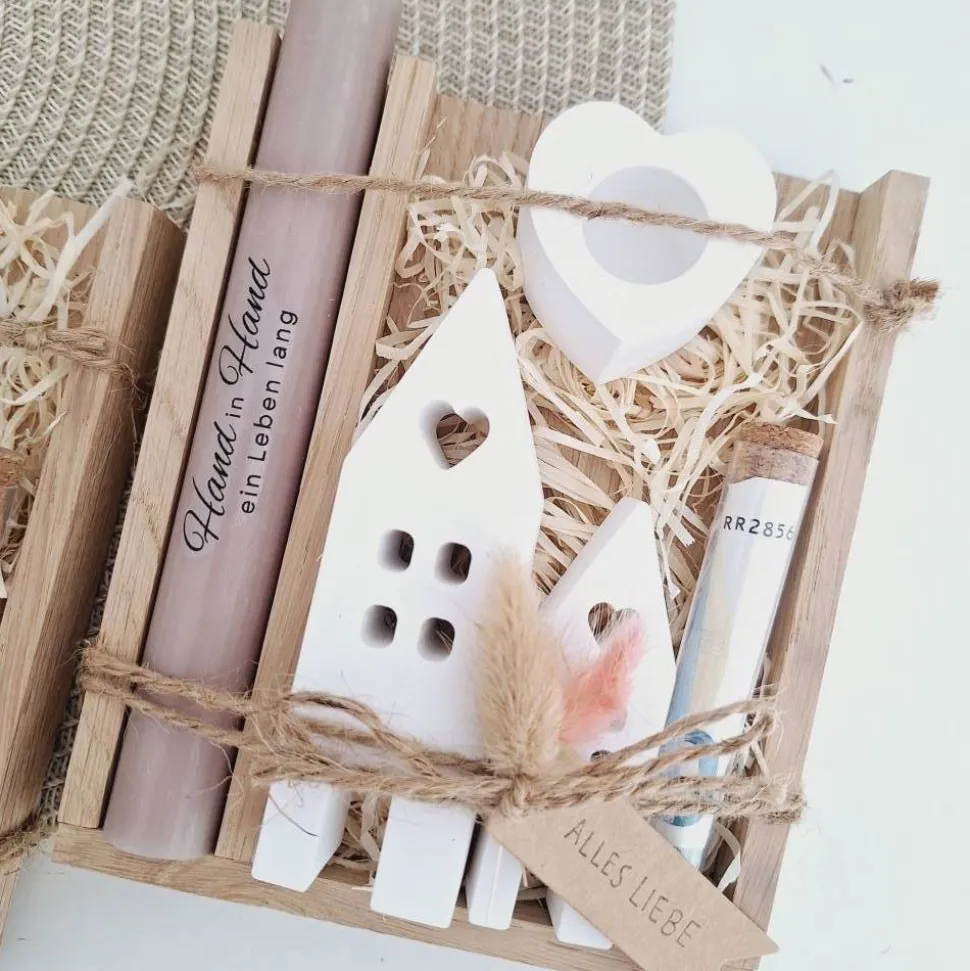 Das Kerzenset besteht aus einer Kerze (in der Farbe deiner Wahl) mit einer Aufschrift deiner Wahl, einem passenden Kerzenhalter in Herzform und zwei Häuser / Lichthäuser.