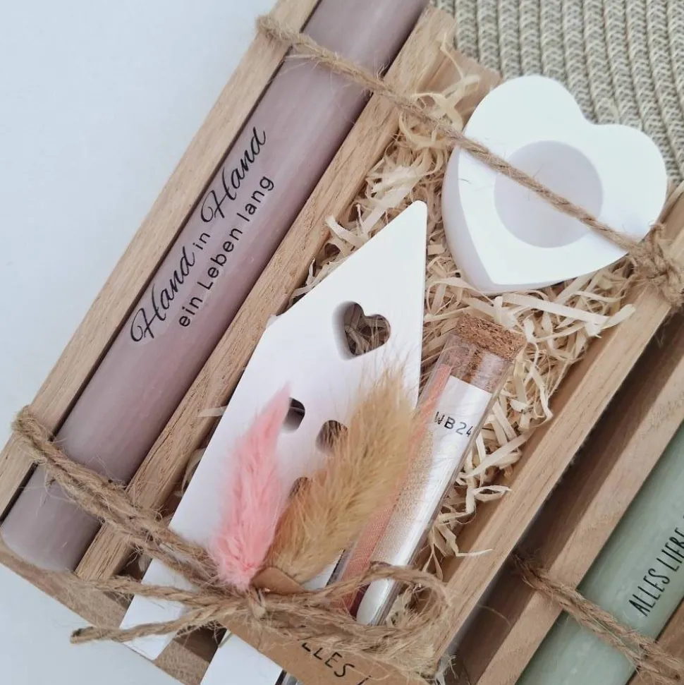 Das Geschenkset wird in einer Holzbox zusammengebunden, mit Trockenblumen (können variieren) verziert und mit einem Anhänger “ ALLES LIEBE “ ergänzt.