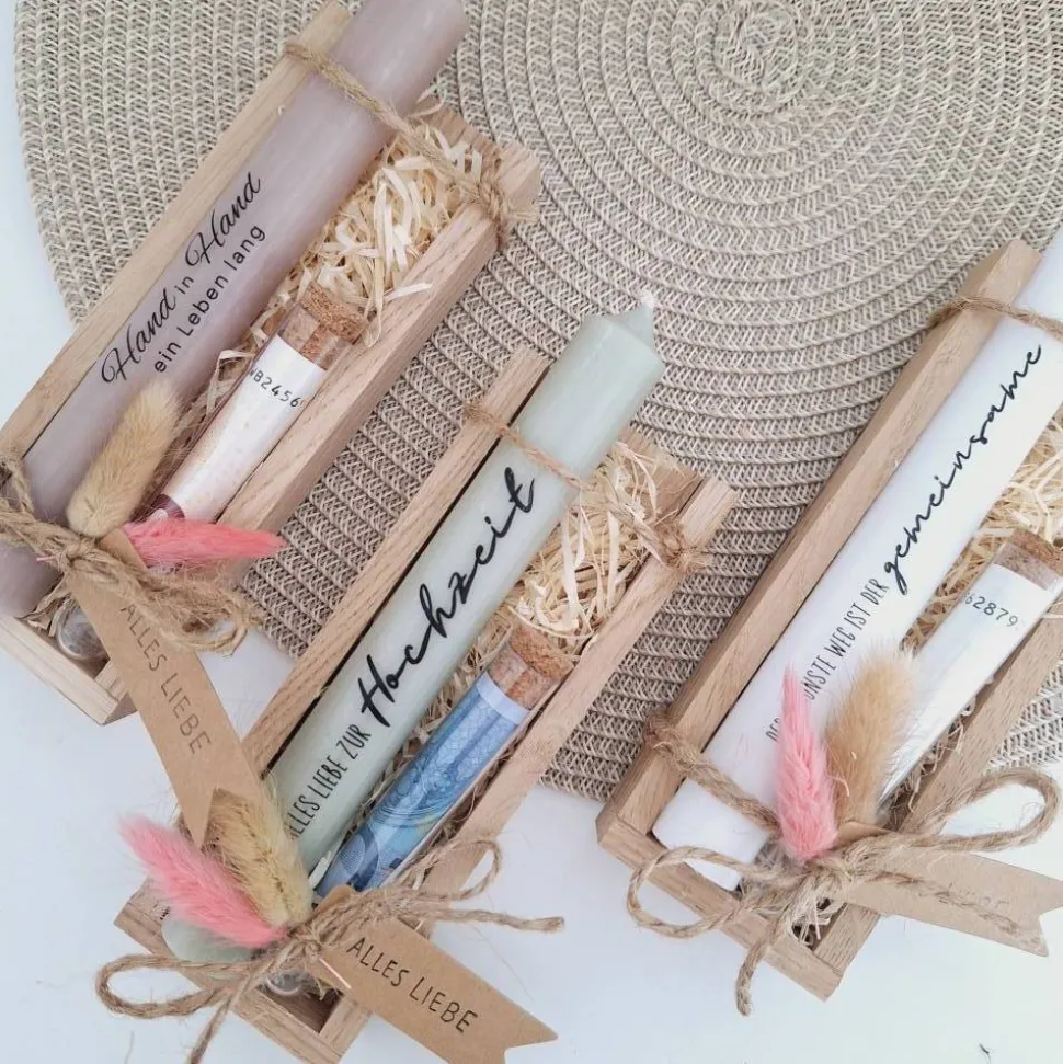 Ergänzt wird das Set mit einem Reagenzglas worin man dem Brautpaar Geld, Gutscheine oder Ähnliches übergeben kann.