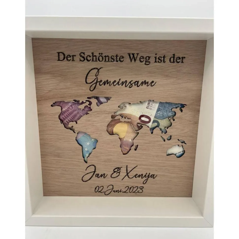 Hinter dem großen Kartenmotiv in der 3mm dicken Birkenholzplatte können Geldscheine beliebig angebracht werden. Dadurch wird das die Weltkarte individuell und einzigartig bunt. Dieses zeitlose und elegante Design überzeugt bei jedem Anlass wie Hochzeiten, Geburtstage, Kommunion usw. Auch nach der Geldentnahme wird der Beschenkte viel Freude als stylische und zugleich zeitlose Wanddekoration damit haben.