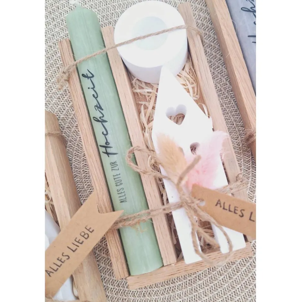 Das Geschenkset wird in einer Holzbox zusammengebunden, mit Trockenblumen (können variieren) verziert und mit einem Anhänger “ ALLES LIEBE “ ergänzt.