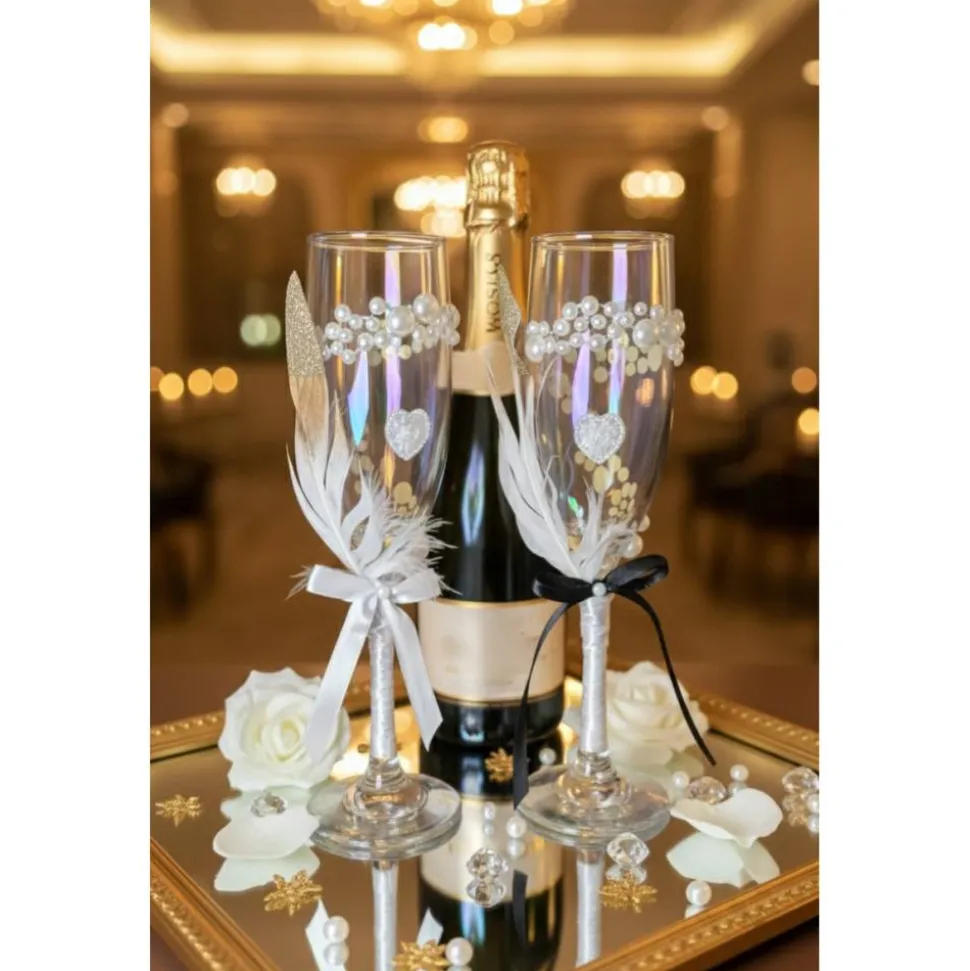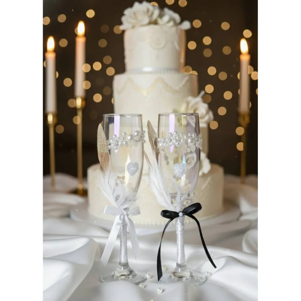 Jedes Glas ist mit glänzenden Perlen, funkelndem AB-Schimmer, eleganten Herz-Elementen und zarten Federn dekoriert. Das Brautglas besticht durch eine weiße Schleife, das Bräutigamglas durch eine edle schwarze Schleife. So wird dieses Set zum perfekten Highlight auf deinem Hochzeitstisch, beim Anschnitt, ersten Toast oder als stilvolle Erinnerung an diesen Tag.