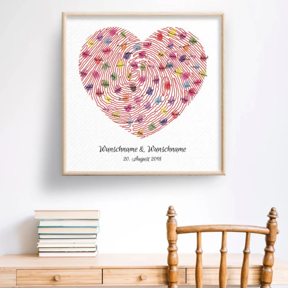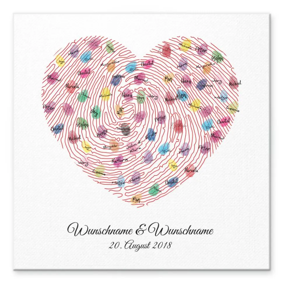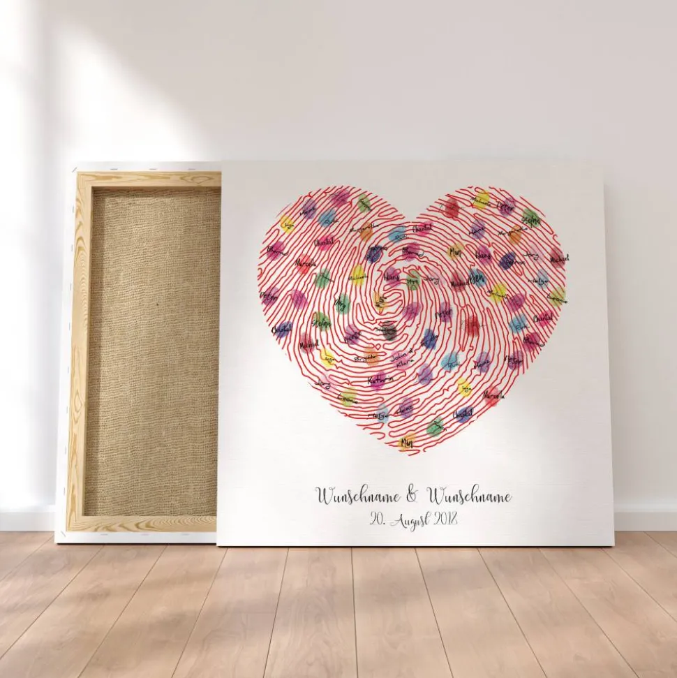 Die Gäste können mit Stempelkissen ihren Fingerabdruck auf der hochwertigen Leinwand hinterlassen und signieren. Ein einzigartiges und individuelles Hochzeitsgeschenk und Spaß auf der Hochzeitsfeier, welches noch lange in Erinnerung bleibt.