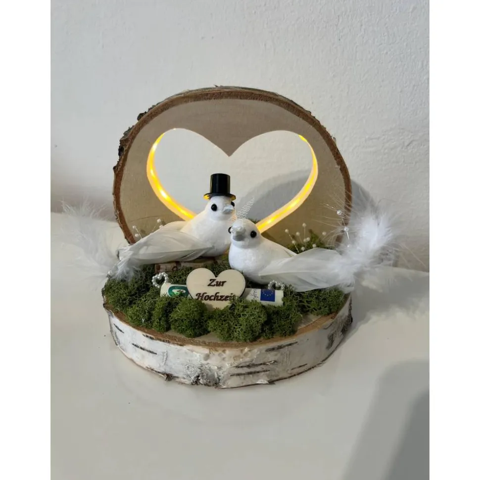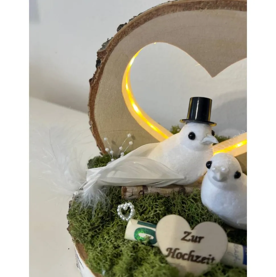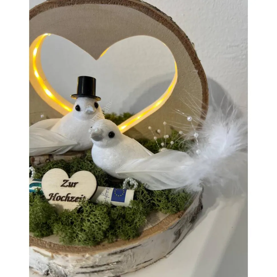 Ein schönes Hochzeitsgeschenk auf einer Baumscheibe mit einem tollen LED Herz, dass man als Geldgeschenk verschenken kann und danach als Erinnerung aufstellen kann 🙂
