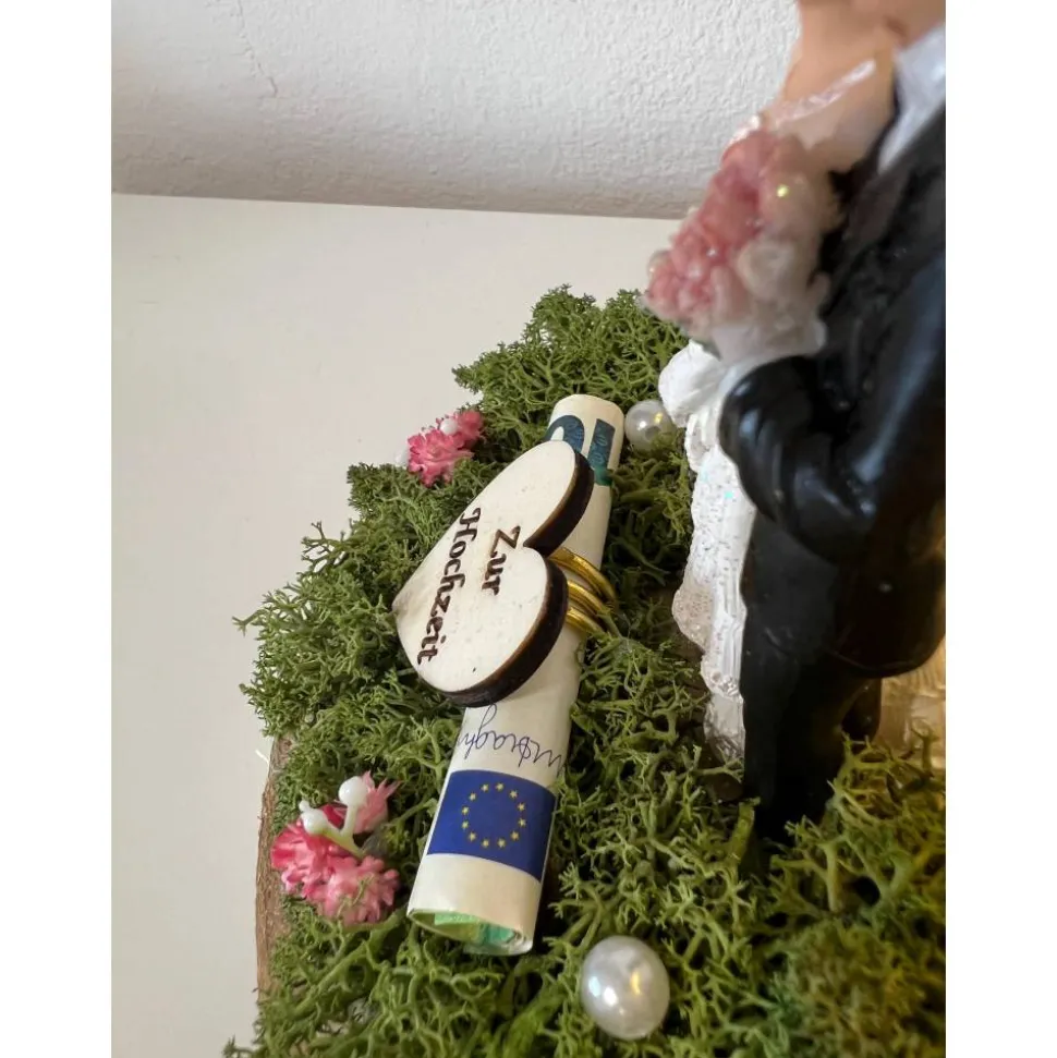 Ein schönes Hochzeitsgeschenk auf einer Baumscheibe mit einem tollen LED Herz, dass man als Geldgeschenk verschenken kann und danach als Erinnerung aufstellen kann 🙂