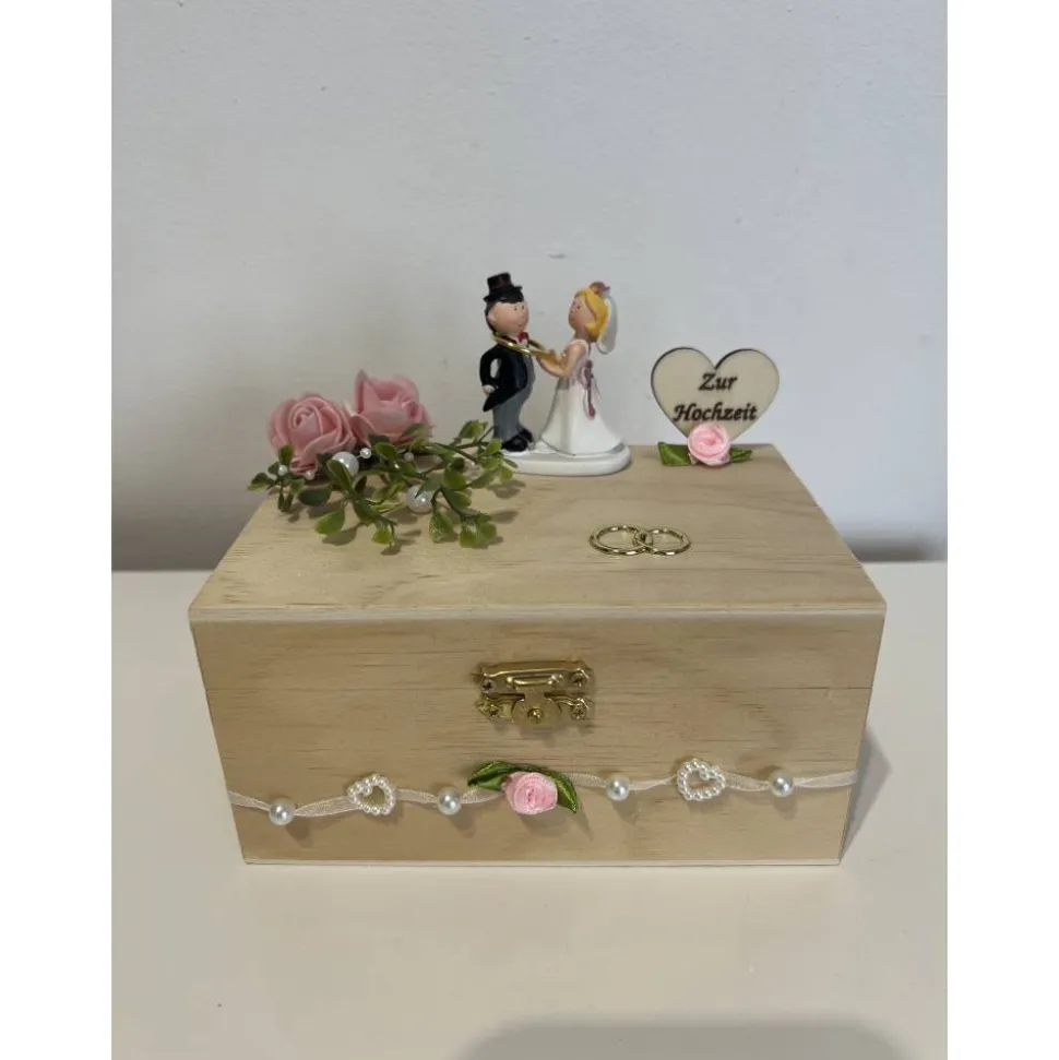 Ein schönes Geldgeschenk zur Hochzeit aus einer Holztruhe mit Brautpaar und verschiedener Hochzeitsdeko, dass man als Geldgeschenk verschenken kann und danach als Erinnerung aufstellen kann 🙂