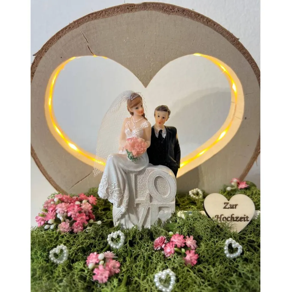 Ein schönes Hochzeitsgeschenk auf einer Baumscheibe mit einem tollen LED Herz, dass man als Geldgeschenk verschenken kann und danach als Erinnerung aufstellen kann 🙂