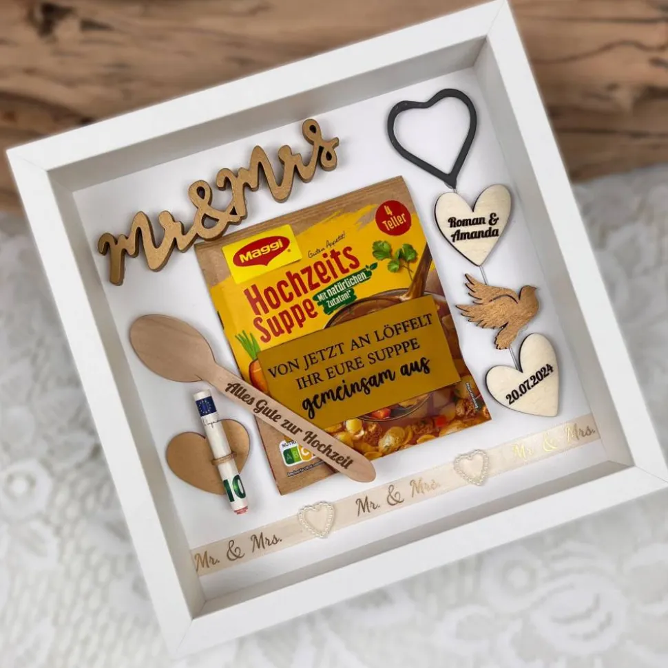 Der Hochzeitsrahmen besteht aus einer Tütensuppe, einem gravierten Holzlöffel, einem Schriftzug aus Holz, einer Wunderkerze in Herzform und gravierten Herzen mit allen Daten und einem Geldring.